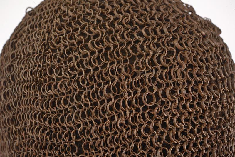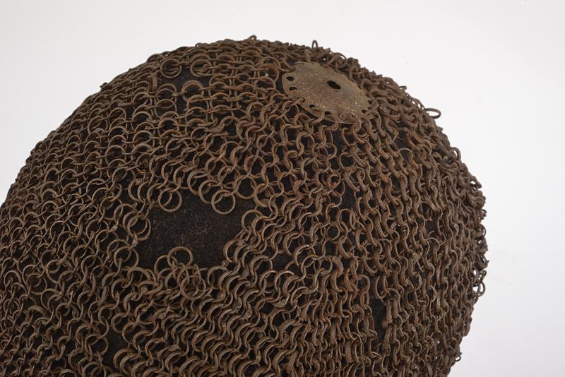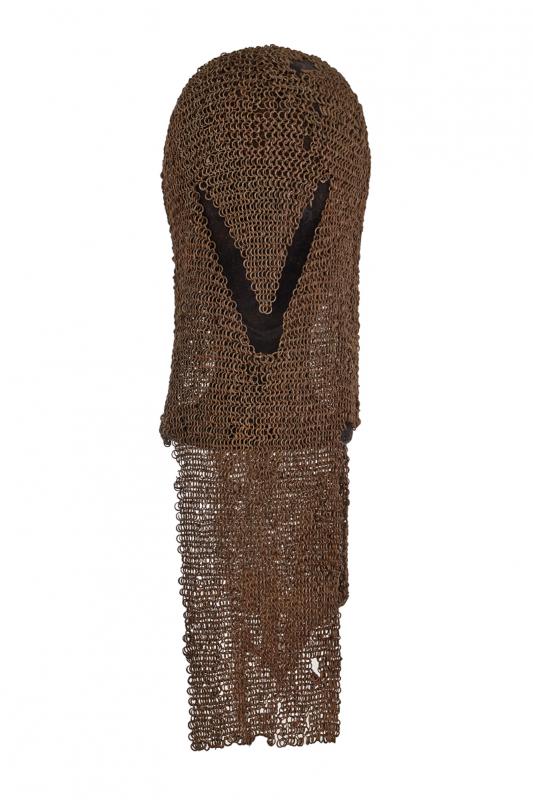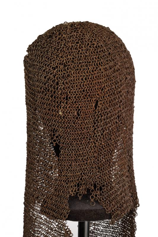 Khula-zirah, datazione: XVI/XVII secolo provenienza: Impero Ottomano, Al sommo un disco in ferro, il camaglio ad anelli con chiusura a mezza bozza, la protezione del volto triangolare ed apribile. La maglia cade sino a proteggere completamente il collo. Piccole mancanze. Rara. altezza 53 cm.