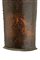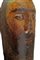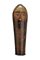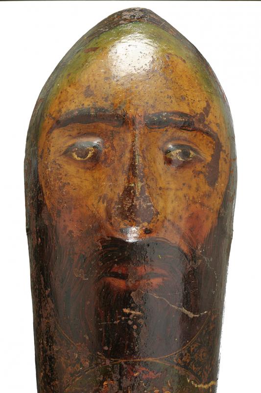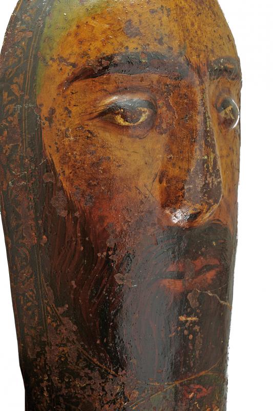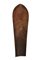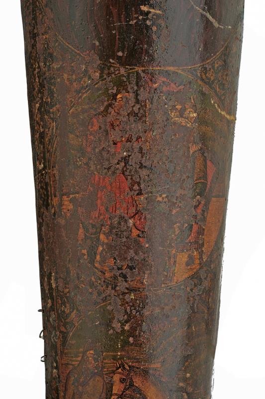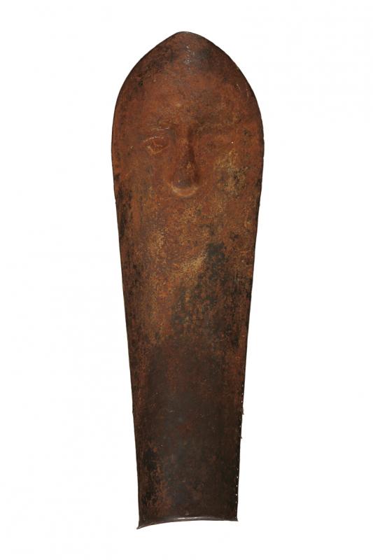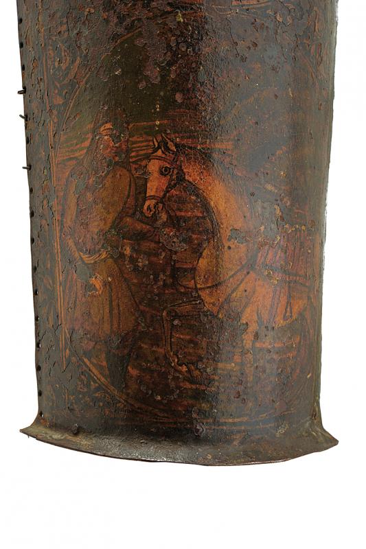 Grande bazu-band dipinto, datazione: XIX Secolo provenienza: Indopersia, In ferro, di forma allungata e convessa. La superfice esterna recante resti di eleganti decorazioni pittoriche. Quella sommitale a volto umano barbuto, con naso, occhi e sopracciglia rilevate. Al centro un cartiglio tondo non più chiaramente interpretabile (probabilmente due uomini d'arme), in fondo un guerriero accanto alla sua cavalcatura. Piccole sforature per il montaggio ai bordi. lunghezza 51,5 cm.