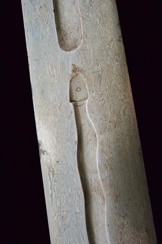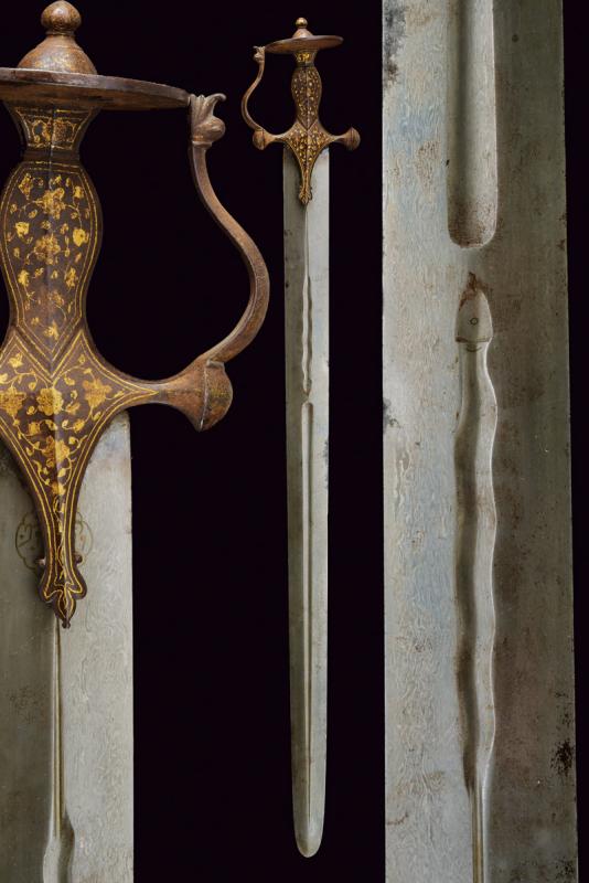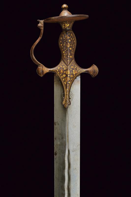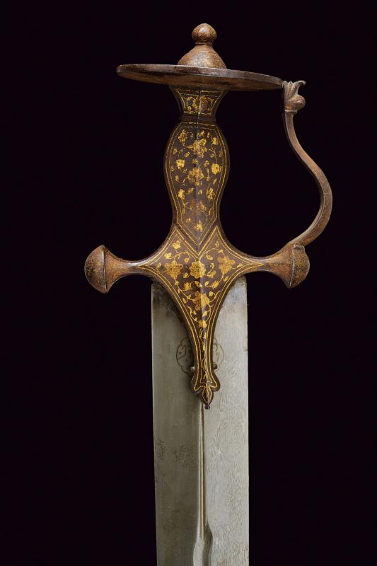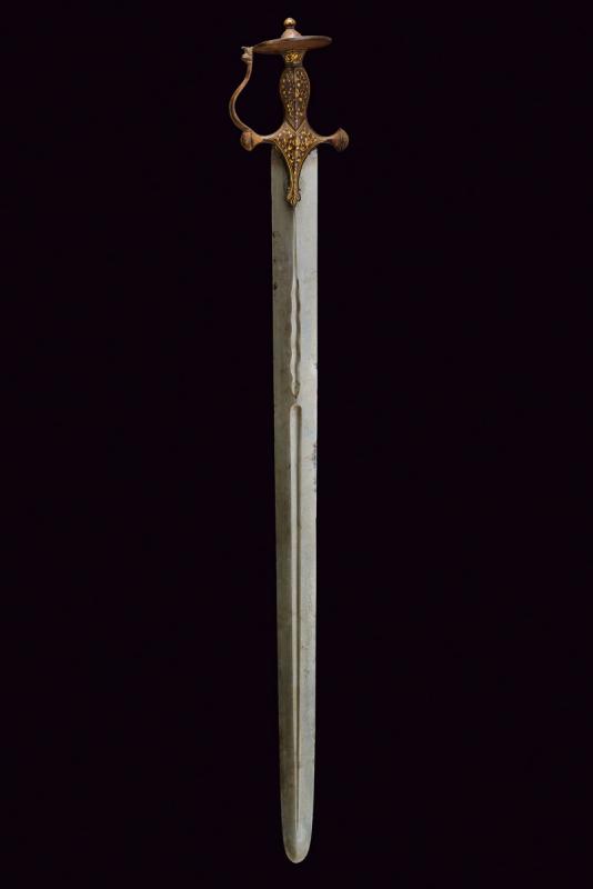 Interessante e rara spada, datazione: XIX Secolo provenienza: Indopersia, Larga lama persiana, dritta, a due fili con punta tondeggiante, in fine damasco. La base con due cartigli recanti iscrizioni in arabo rimessi in ottone, seguiti da un serpente con coda, la testa con occhio e lingua, e infine una sgusciatura centrale fino quasi alla punta, alcune piccole zone con danni da ruggine. Fornimento da tulvar in ferro con ramo di guardia e decorazioni in oro presenti all'80 %. lunghezza 88 cm.