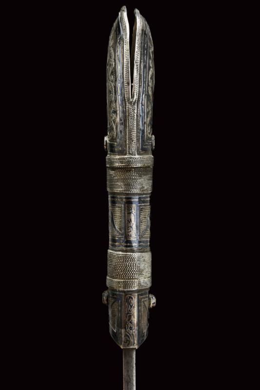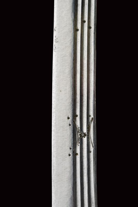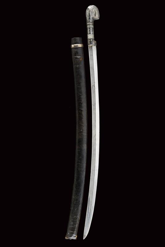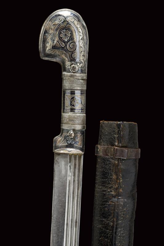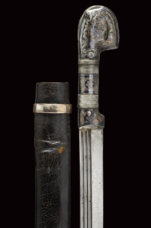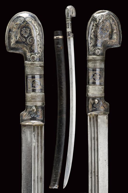 Shasqua niellata, datazione: 1900 circa provenienza: Caucaso, Lama curva a un filo e breve controfilo, triplice sgucio, decorazioni a puntini e marchio a fiore tra mezzelune dentate. Impugnatura in argento, incisa e decorata a niello a motivi floreali. Al dorso due brevi iscrizioni in caratteri arabi. Fodero in cuoio (danni sul fondo) con passante in ferro. lunghezza 91 cm.