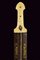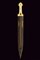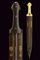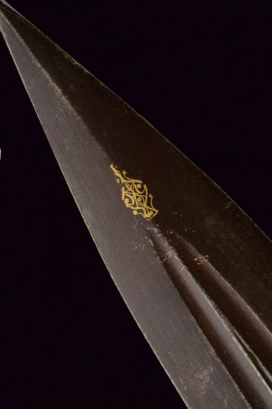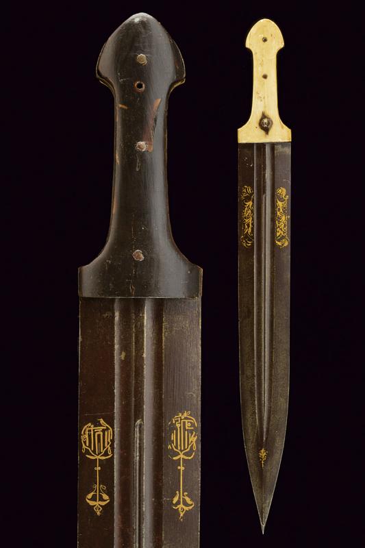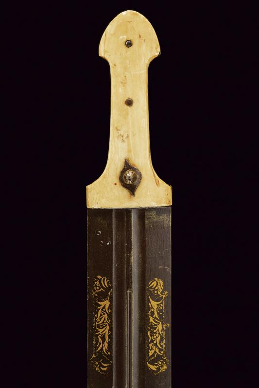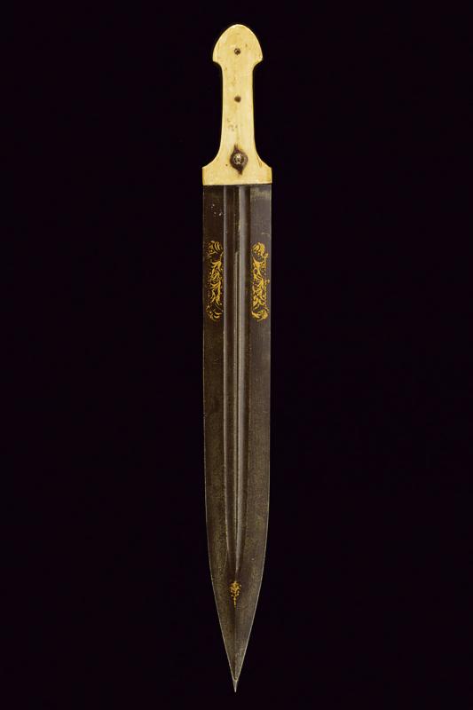 Kindjal, datazione: Fine del XIX Secolo provenienza: Caucaso, Lama dritta a due fili, con doppio sguscio e sottile scanalatura centrale, costolata al debole e munita di punta ingrossata, su entrambe le facce tre aree con resti di decorazioni ageminate in oro. Le guancette in corno chiaro anteriormente e scuro sul retro. Un rivetto con borchietta, l'altra mancante. La banda centrale leggermente incisa. lunghezza 59,3 cm.