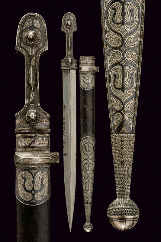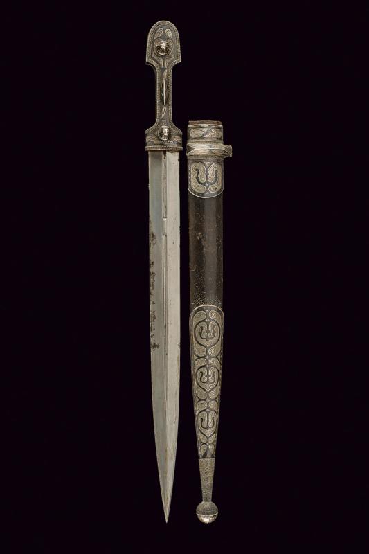 Kindjal con fornimenti in argento, datazione: 1900 circa provenienza: Caucaso, Lama dritta a due fili, con due segmenti sgusciati al centro sul lato anteriore, su quello posteriore un singolo sguscio che corre per quasi tutta la lunghezza. Impugnatura con guancette in corno bruno, completamente rivestita sul lato anteriore con lamina d'argento decorata a cornicette perlinate e con disegni a foglie incisi e bordati con bande a niello. I tre ribattini muniti sempre sul lato anteriore di grande borchia, due di forma cuspidata, una più allungata. Fodero ligneo rivestito di cuoio sul lato anteriore. Puntale e cappa in argento con decori en suite con il pugnale. Il retro con alcuni disegni geometrici. Tipico spesso passante e sfera sul fondo. lunghezza 48,5 cm.