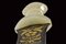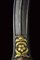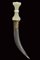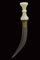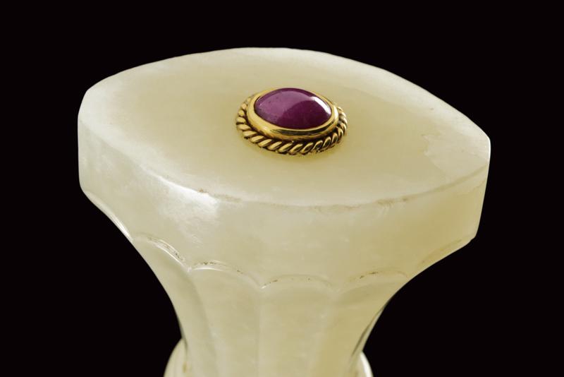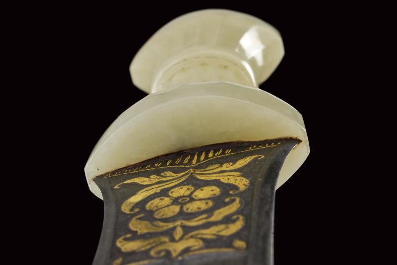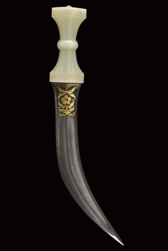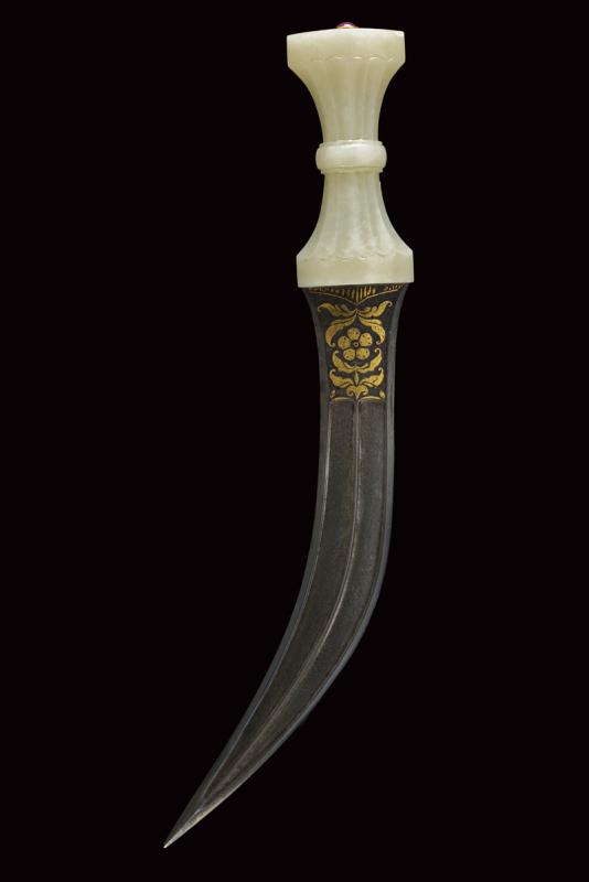 Bellissimo kandshar con impugnatura giada, datazione: Metà del XIX Secolo provenienza: Indopersia, Robusta lama curva in raffinato damasco scuro, a due fili, con punta rinforzata (piccolissima mancanza), doppia scanalatura con nervatura centrale, intagliata alla base e dorata a motivi floreali. Impugnatura in fine giada opaca intagliata a clessidra con profonde scanalature ed anellatura al centro. Il pomo decorato con un rubino, con montatura a cabochon in oro. lunghezza 37.5 cm.