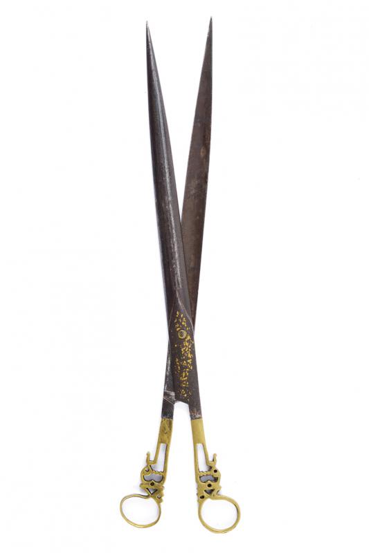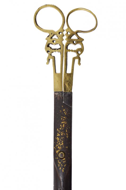 Forbice da scriba, datazione: XVIII Secolo provenienza: Impero Ottomano, Rara forbice di manifattura Ottomana. In acciaio forgiato con la parte superiore in ottone in forma calligrafica (?) e con la parte in acciaio decorata con resti alla damaschina in oro. Serviva a tagliare le pergamene ed, in emergenza, da arma. Un esemplare identico si trova a Gerusalemme, nell'Israel Museum, esposto nello 'Shrine of the Book' (l'esposizione dei rotoli del Mar Morto). lunghezza 28 cm.