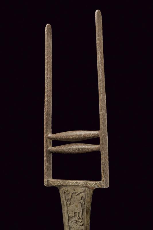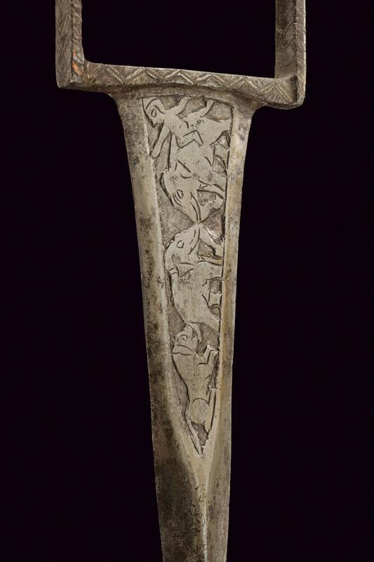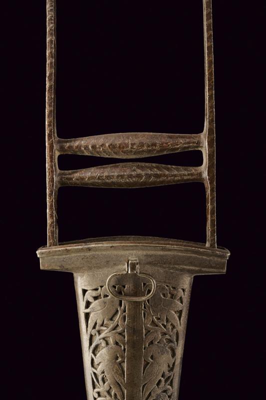 Katar con fodero in ferro, datazione: XIX Secolo provenienza: India, Robusta lama a due fili con punta fortemente rinforzata; la prima parte intagliata, con elefante, leone, tigri e personaggio in bassorilievo. Tipica impugnatura con doppia traversa decorata a motivi geometrici in argento. Fodero in legno completamente rivestito in ferro traforato con pappagalli e fiorami. Anello di sospensione. Raro. lunghezza 38 cm.