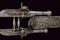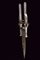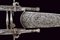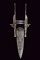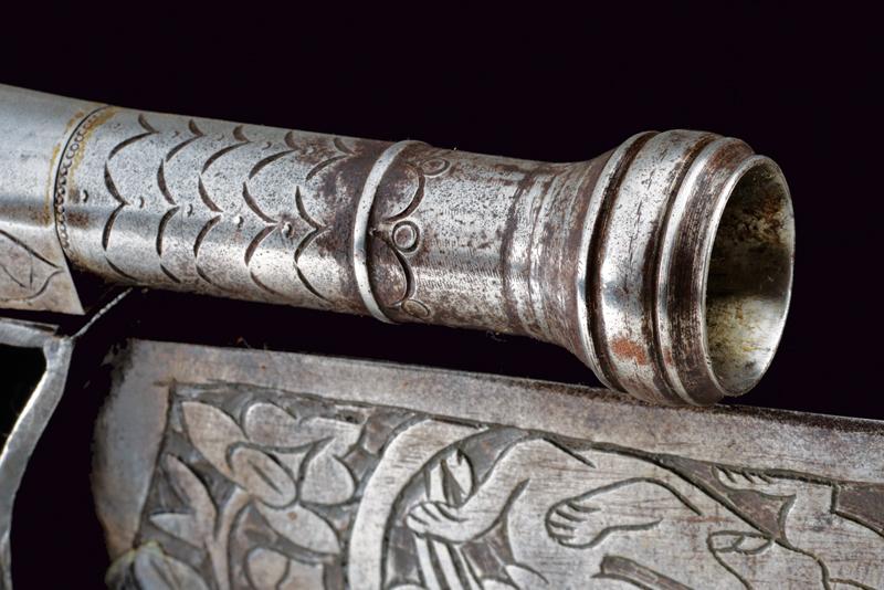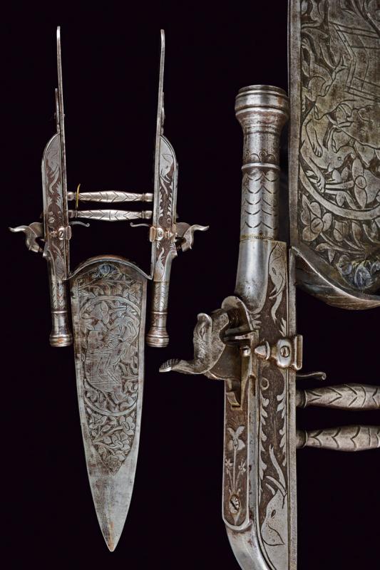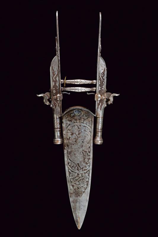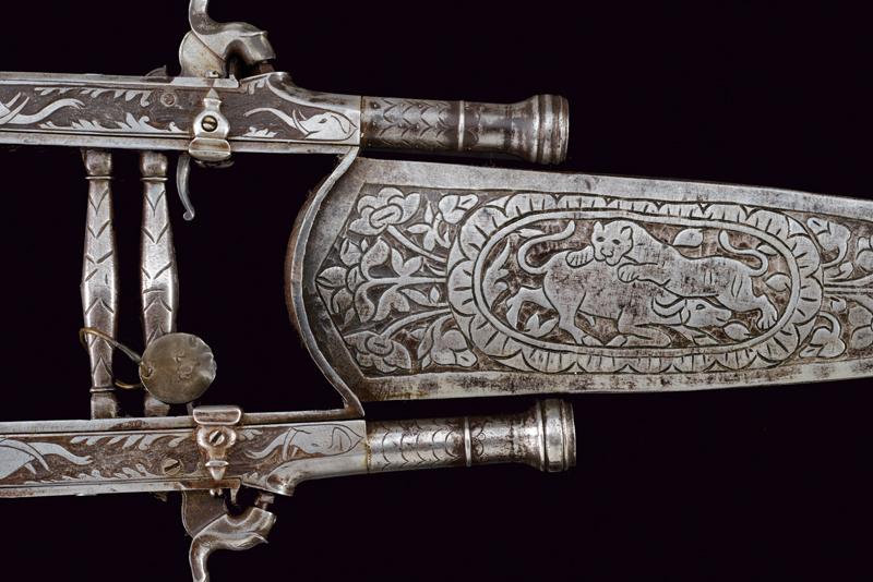 Interessante e raro katar con pistola a luminello, datazione: Metà del XIX Secolo provenienza: India, Larga lama a due fili con punta leggermente rinforzata e base intagliata con un elefante, un leone fra motivi floreali su un lato, e una leonessa a caccia di un bue sull'altro lato. Impugnatura con due traverse incise, i lati muniti di pistole a luminello con canne tonde e volete a cannoncino, i castelli intagliati con teste di elefante e onde. Doppio grilletto. Vedi 'Arms and Armor, traditional weapons of India', di J .Jaiwant Paul, p 74; 'Blades and Barrels' di Gordon Frost ,1972, p 83, n 46. lunghezza 53 cm.