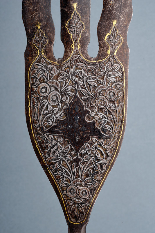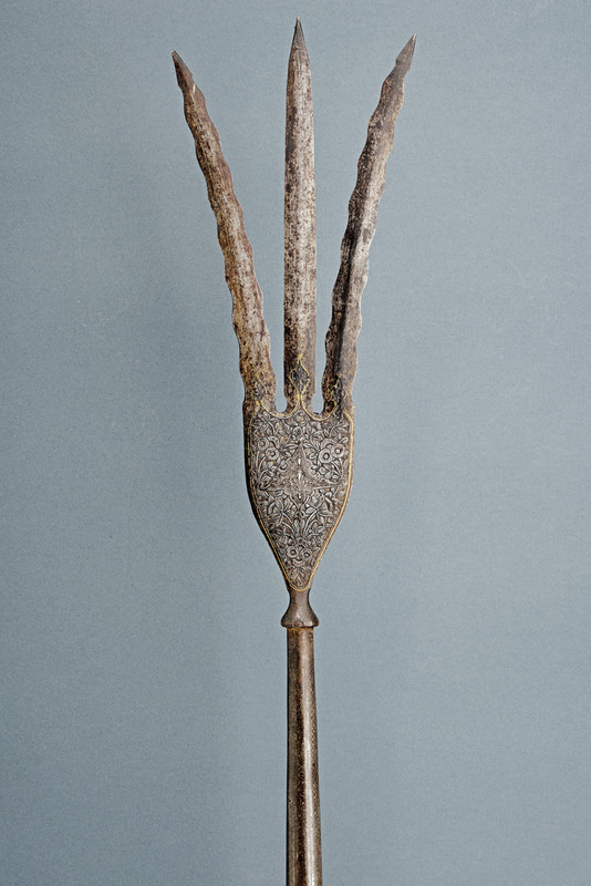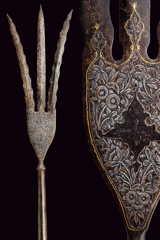 Tridente, datazione: XIX Sec. provenienza: Indopersia, Testa a triplice cuspide con lame esterne ondulate, quella centrale liscia; la base finemente incisa a motivi floreali con cornice in oro; gorbia troncoconica con resti di decorazioni in argento. Fusto cilindrico in legno. altezza 192.5 cm.
