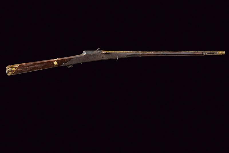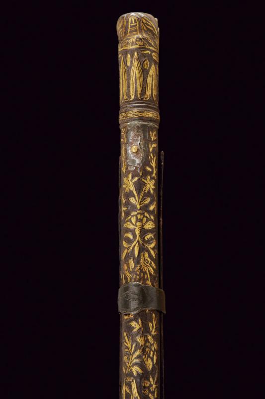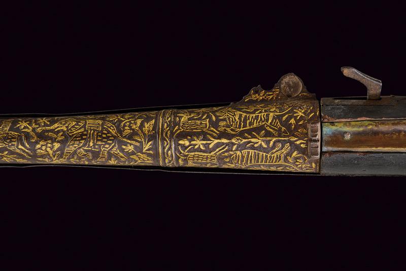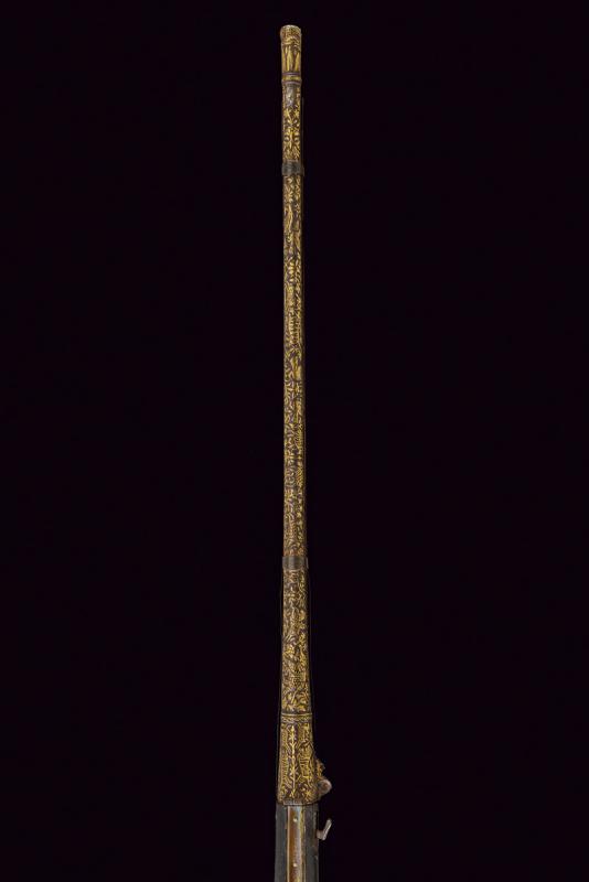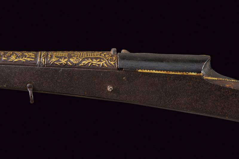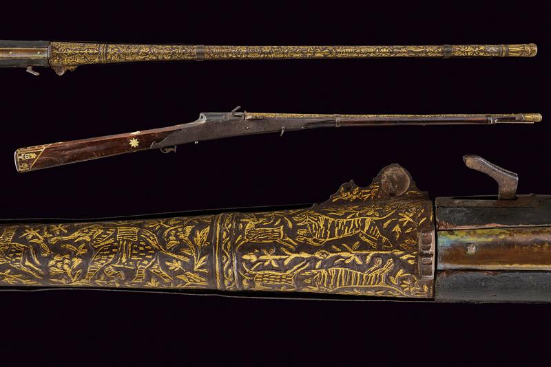 Torador shikargar a miccia, datazione: XIX Secolo provenienza: India, Canna tonda liscia, completamente intagliata con scene di caccia, con personaggi e sfondo tutti delineati in oro; con tigri, elefanti, uccelli ad altri animali ed un cacciatore a cavallo su una trama floreali. La volata intagliata a testa di tigre e parzialmente dorata, dotata di mirino, cal. 15 mm. Scodellino laterale parzialmente dorato e privo di copertura. Serpentina e grilletto funzionanti. Lunghe placche in ferro sui fianchi. Cassa lunga in legno con bacchetta in ferro. Piccole tarsie in osso sul calcio. Il grilletto traforato a volute. lunghezza 126 cm.