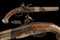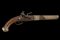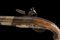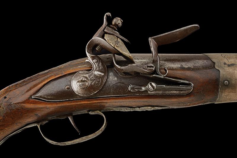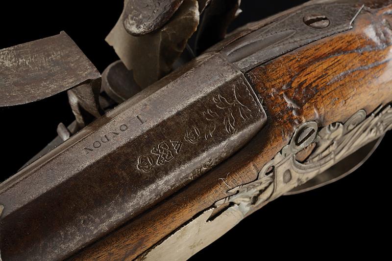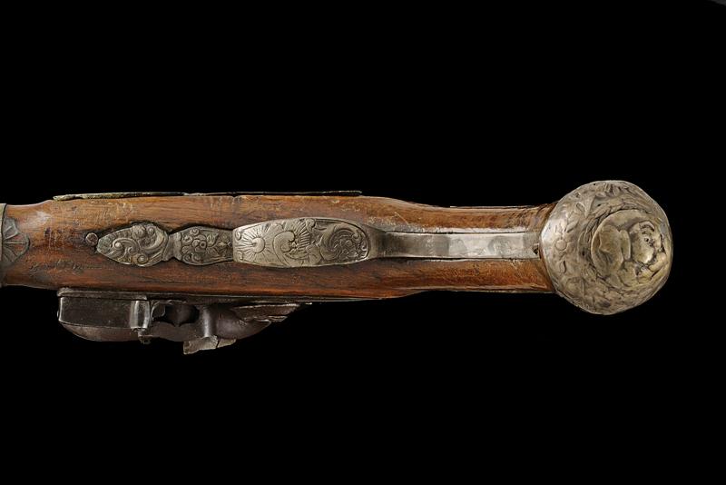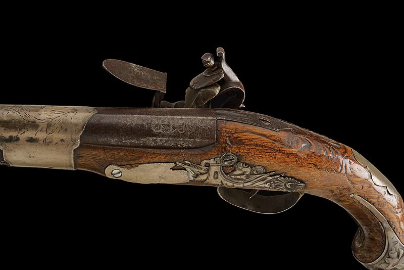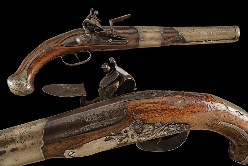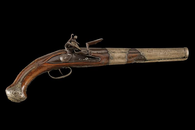 Pistola a pietra focaia, datazione: XVIII/XIX Secolo provenienza: Turchia, Canna tonda liscia con base ottagonale, il dorso piatto marcato 'LONDON' e con vari punzoni fra i quali il marchio di St. Etienne (?), cal. 16,5 mm. Codolo con traguardo incavato e incisioni. Batteria firmata 'Wilson'. Meccanica funzionante ma il cane traballa e la meccanica è a un singolo scatto. Collo del cane con trofeo in rilievo. Cassa in legno. Fornimenti in metallo bianco (argento?) la coccia con resti di trofei in rilievo e punzone 'E' coronato; code riparate. Contropiastra con un trofeo di bandiere e mezzaluna attorniata da raggi e un segmento riparato. Mezzaluna su raggi presente anche sul ponticello. I due lunghi reggicanna lisci e recanti resti di incisioni, tipica finta bacchetta. Pistola europea per il mercato di esportazione o preda bellica? lunghezza 40 cm.
