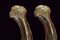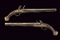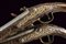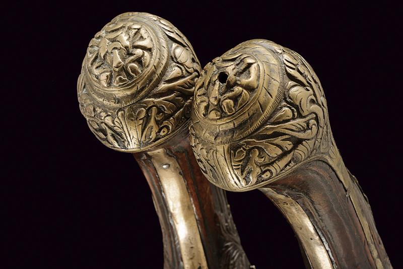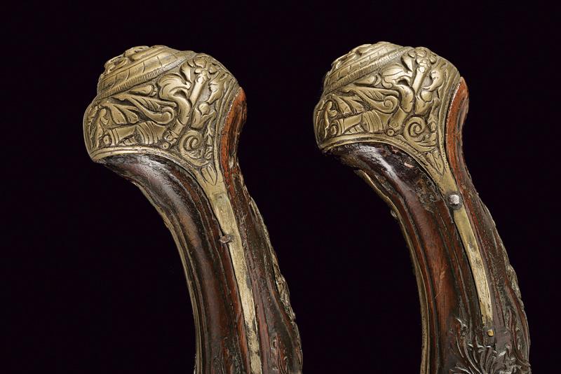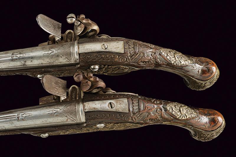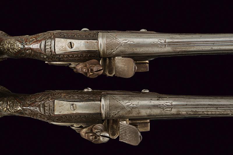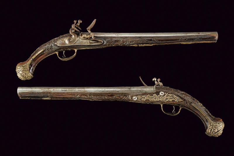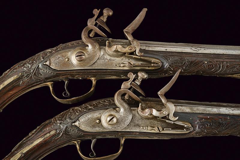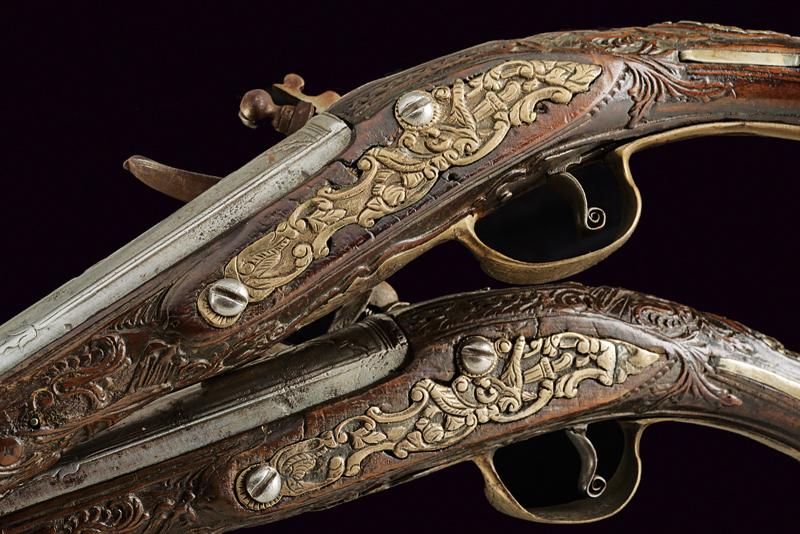 Paio di pistole a pietra focaia da fonda, datazione: Prima metà del XIX Secolo provenienza: Turchia, Canne tonde lisce, munite alla base di un cartiglio con decoro floreale intagliato, nel primo segmento lungo entrambi i fianchi una nervatura terminante in un bocciolo in rilevo, l'area centrale fino al dorso con una lunga bindella percorsa da nervature longitudinali e con fiori alle estremità. Cal. 16,8 mm. in volata. Codoli lisci. Batterie (di produzione inglese?) a cartella tondeggiante e recante incisioni floreali e cornicette. Meccaniche funzionanti, scodellini a tenuta stagna. Casse intere in legno riccamente intagliate a motivi floreali (piccoli danni e restauri, segni d'uso e del tempo). Fornimenti in ottone. Belle cocce con trofei in rilievo. I ponticelli incisi a motivi floreali. Le contropiastre lavorate en suite con le cocce. Semplici bacchette in legno. lunghezza 50,5 cm.
