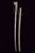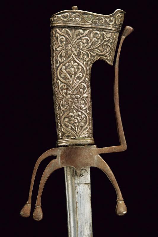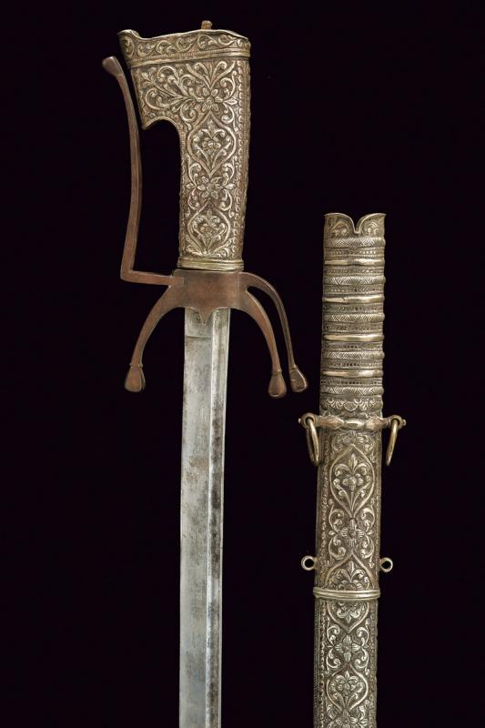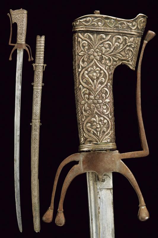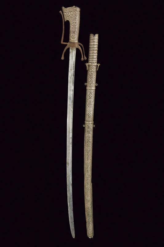 Nimcha con fornimenti in argento, datazione: XIX Secolo provenienza: Marocco, Lama curva a un filo con sgusciatura dorsale e resti di marca sul tallone. Fornimento tipico in ferro con impugnatura ricoperto di lamine d'argento sbalzato a motivi floreali in bassorilievo. Fodero in legno ricoperto completamente in lamina d'argento decorato en suite. Due anelli di sospensione. lunghezza 102.5 cm.