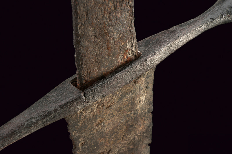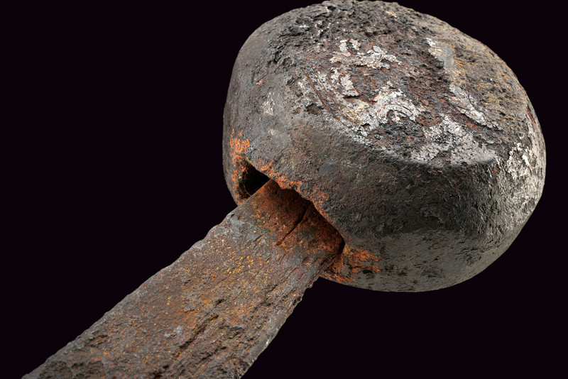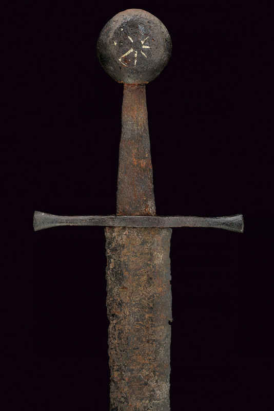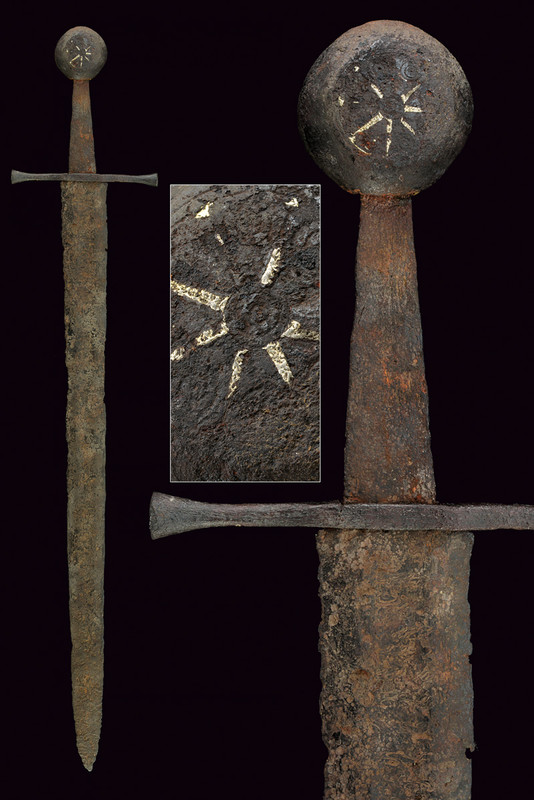 Spada medievale, datazione: primo quarto del XII Sec. provenienza: Germania, Larga lama dritta a due fili con leggero sguscio centrale e resti di iscrizioni; impugnatura con codolo trapezoidale, elso dritto con bracci di sezione tonda che si ingrossano verso le estremità, grande pomo ovale. Su un lato resti di decorazioni in argento a raggi, il lato opposto con pochissimi resti. Di buona consistenza e di bella forma compatta. Spada del tipo X Oakeshott. Molto simile alla spada Witham. Vedi Oakeshott, pag. 34 Cat. X 15 datata 1100-1150. Vedi anche 'Selected Antiques Arms And Armour - The Abildgaard Collection', dove è illustrata, a pag. 36/7 no. 1.10, con testo. Il libro è incluso nel lotto. lunghezza 89.3 cm.