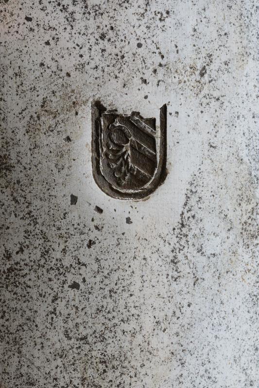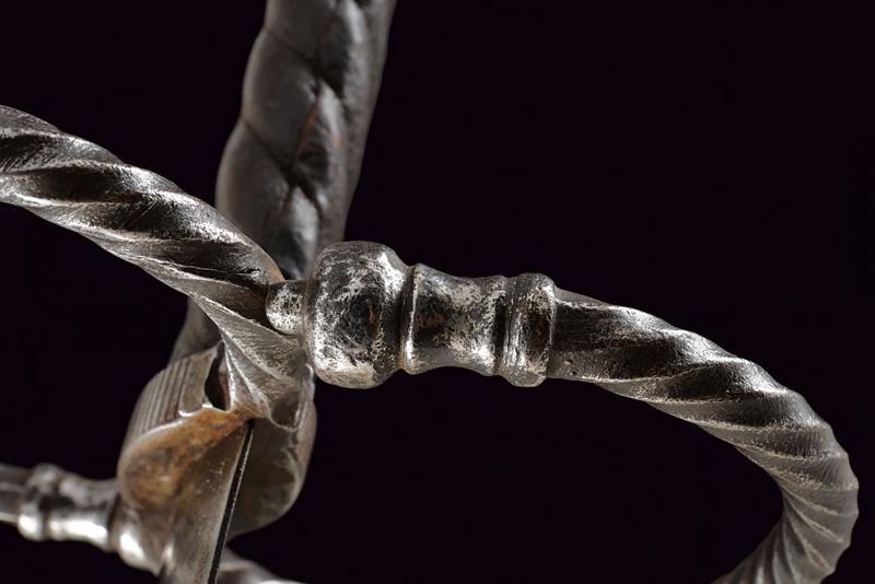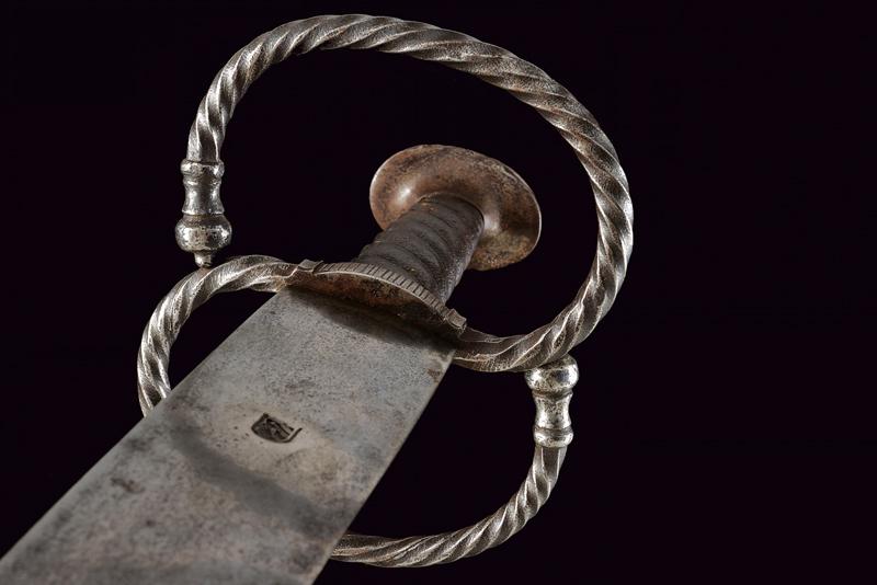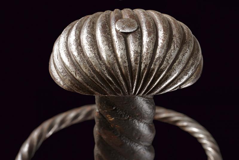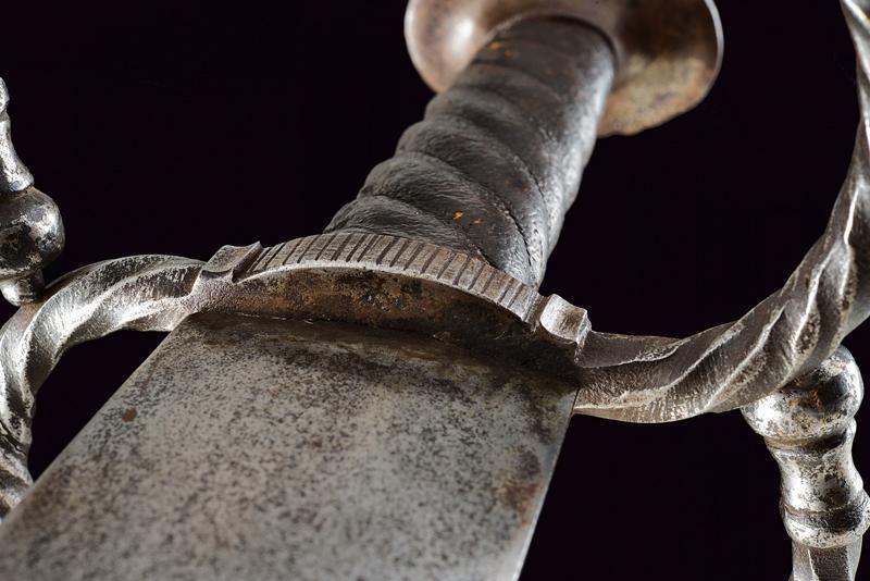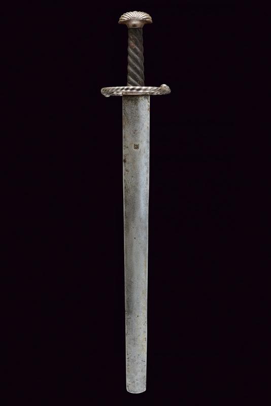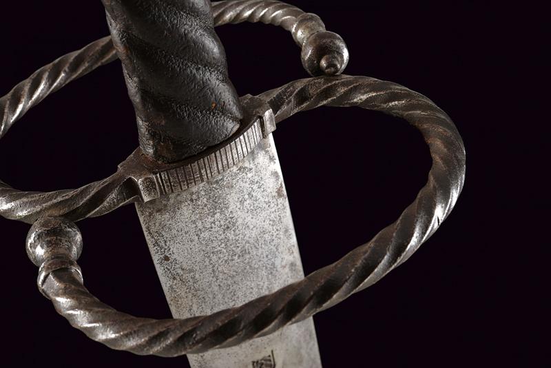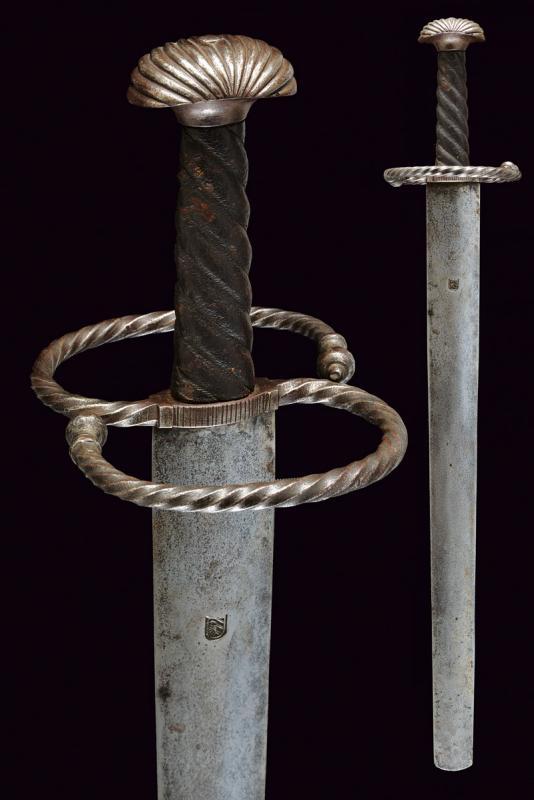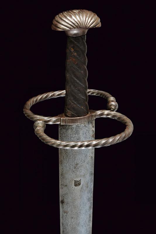 Lanzichenetta composita, datazione: XVI Sec. provenienza: Germania, Ampia e corta lama dritta, probabilmente del XIX secolo, a due fili paralleli e di sezione lenticolare, recante un punzone effigiante l'emblema di Norimberga. Elso probabilmente antico, di tipica forma a 'S', con bracci tortili terminanti a bulbi bottonati su breve collo. L'impugnatura d'epoca ottocentesca con decoro tortile e rivestimento in manica di cuoio. Il pomo probabilmente antico, in ferro, di sezione ellittica, decorato a cannellini trasversali al dorso e con breve collo. lunghezza 72,3 cm.