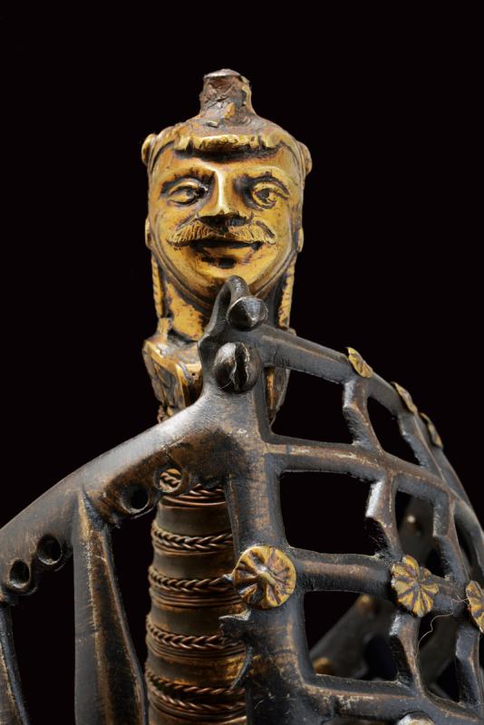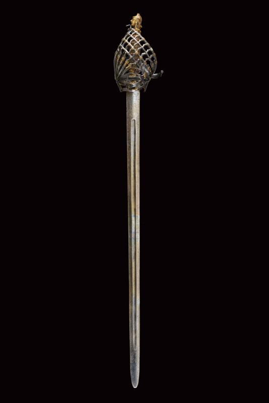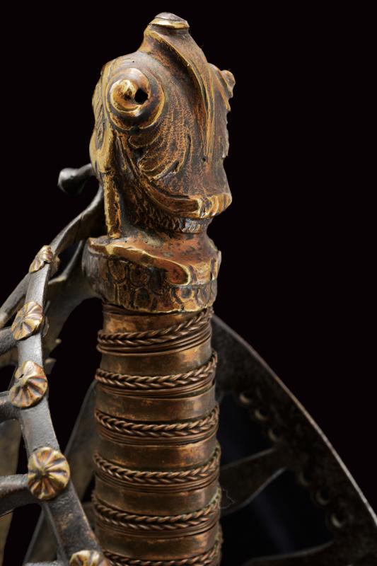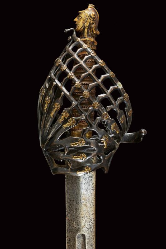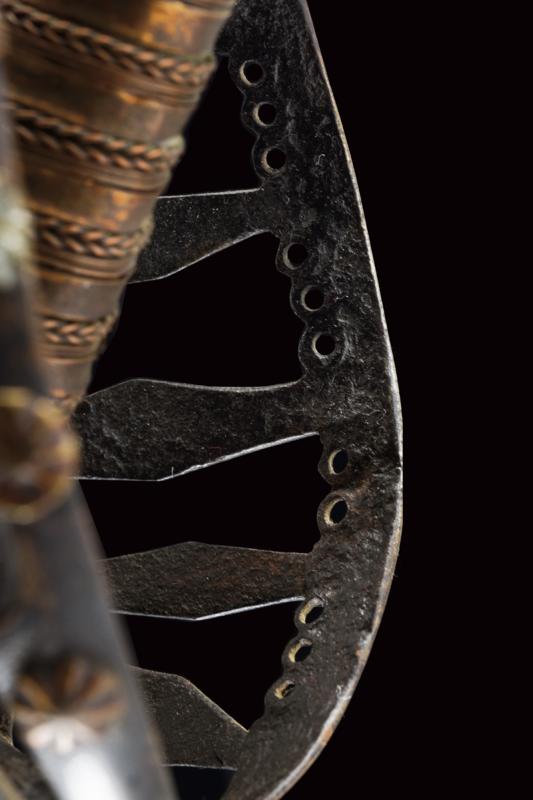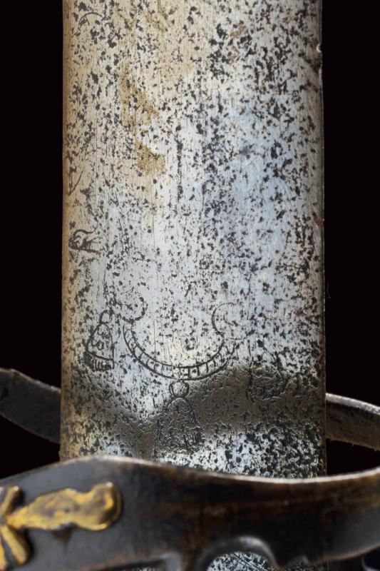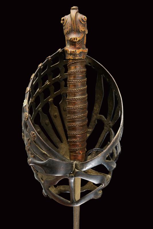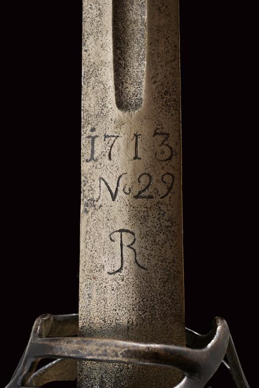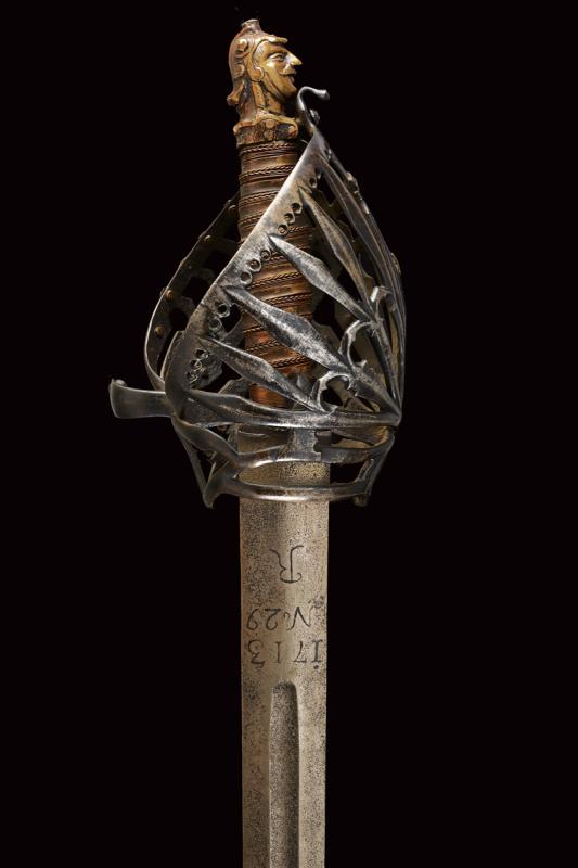Bellissima schiavona da ufficiale, datazione: 1713 provenienza: Repubblica di Venezia, Robusta lama dritta di sezione lenticolare, recante nel segmento centrale un lungo sguscio che si interrompe a circa 10 cm. da punta e base. Sul lato di terza al forte incisione di un emblema purtroppo quasi completamente svanita, l'unico elemento ancora visibile un collare con pendenti. Sul lato di quarta la data '1713' e 'N. 29 R'. Elegante fornimento in ferro a gabbia effigiante il leone di San Marco stilizzato. Il lato anteriore arricchito con fornimenti in ottone dorato decorati a rosette. Impugnatura con rivestimento a spirale di piattina in rame alternata a trecciole. Il pomo in ottone a testa di guerriero lavorata a tuttotondo. lunghezza 109,5 cm.