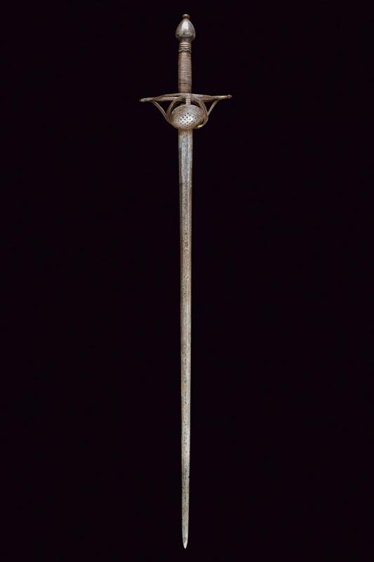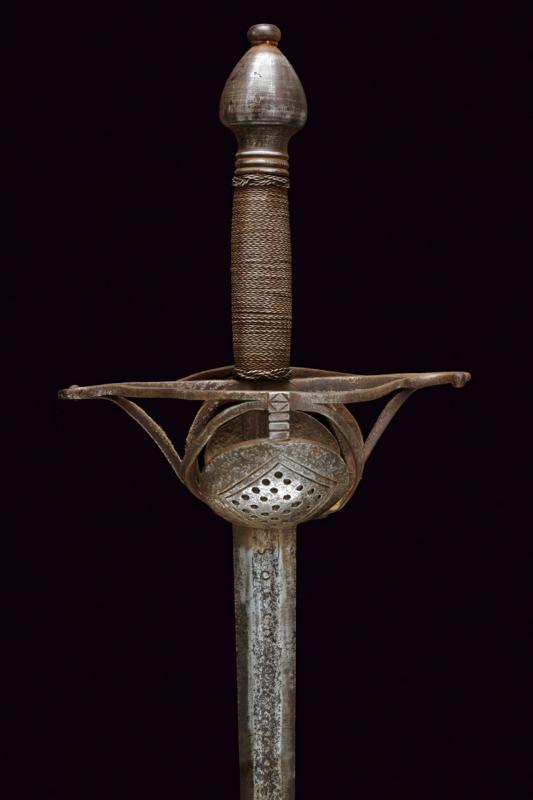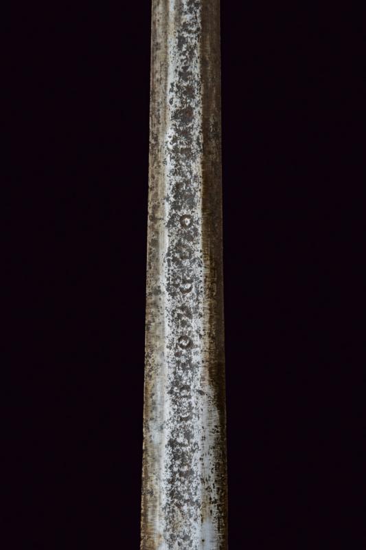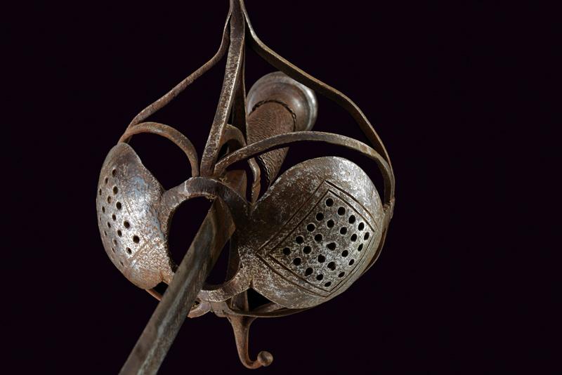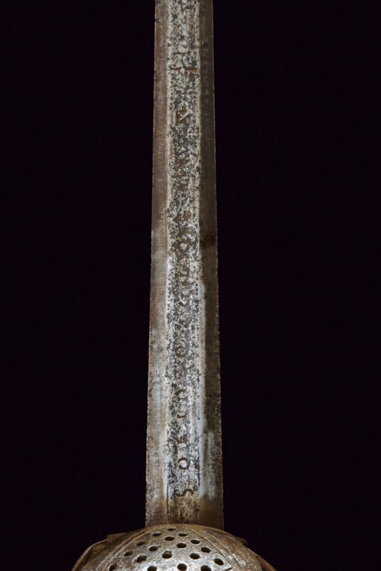 Spada da lato, datazione: 1620 - 1640 provenienza: Germania, Lama dritta di sezione esagonale, con intaccature e qualche dente in punta, recante al forte su entrambi i lati il marchio a testa di re ben visibile e resti del motto 'SOLI DEO GLORIA' (non chiaramente leggibile). Fornimento in ferro. Le due robuste valve con decoro a rombo e sforature, collegate tramite un elemento di raccordo ai ponti e agli anelli sull'elso. I bracci dritti e con terminazioni controcurvate sul piano di lama e bottonate. Impugnatura con teste di moro e trecciola in ferro (più tarda?). 'Soli Deo Gloria' è uno dei cinque Sola (principi fondamentali) della Riforma Protestante. Interessante esemplare forse risalente alla Guerra dei Trent'anni. lunghezza 109,5 cm.