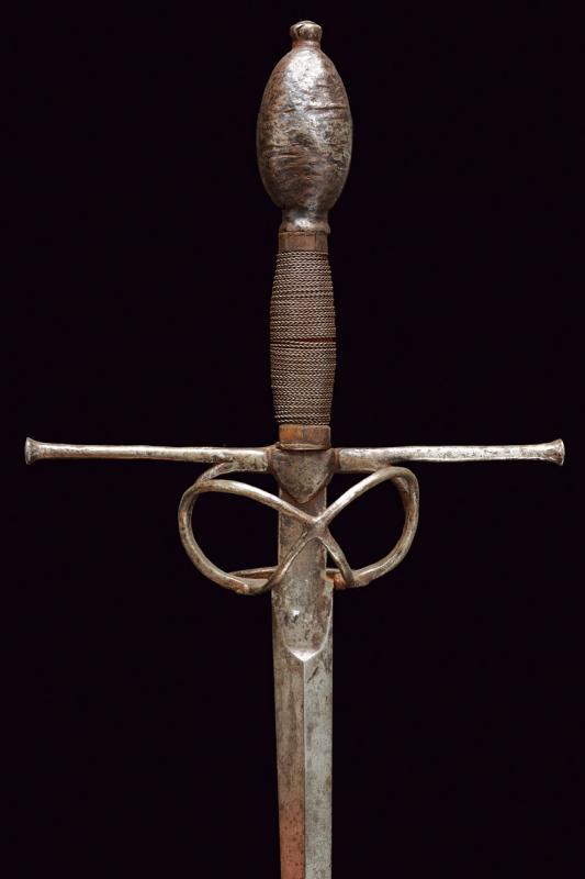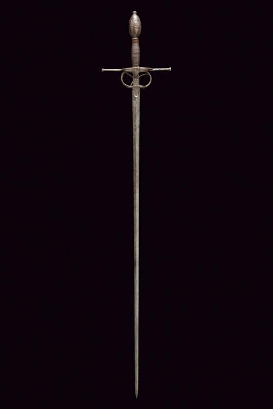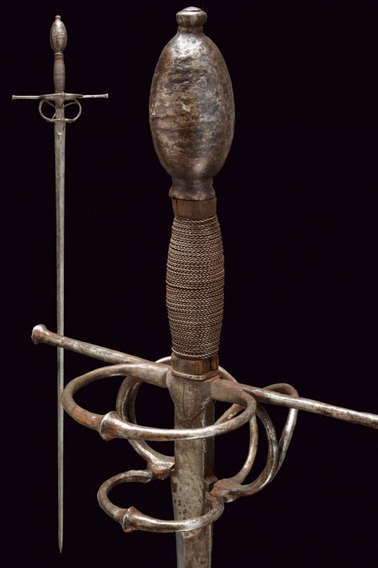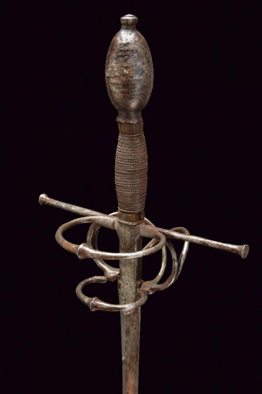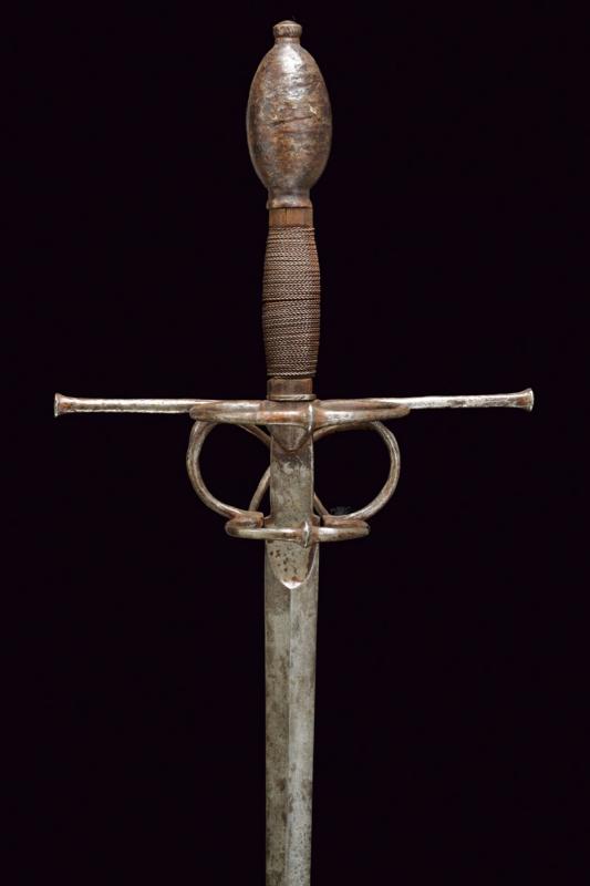 Spada da lato, datazione: 1630 circa provenienza: Olanda, Robusta lama di sezione a losanga con tallone e ricasso schiacciati; fornimento in ferro a due ponti con nodi costolati al colmo, bracci dritti allargati e tronchi alle estremità, controguardia a rami incrociati, grande pomo a oliva con basetta e bottone. Impugnatura in legno con trecciola in filo di ferro, le teste di moro mancanti. lunghezza 120 cm.