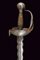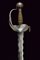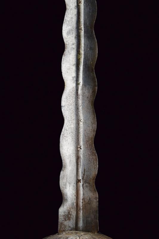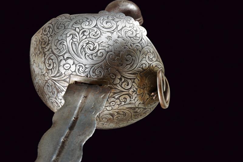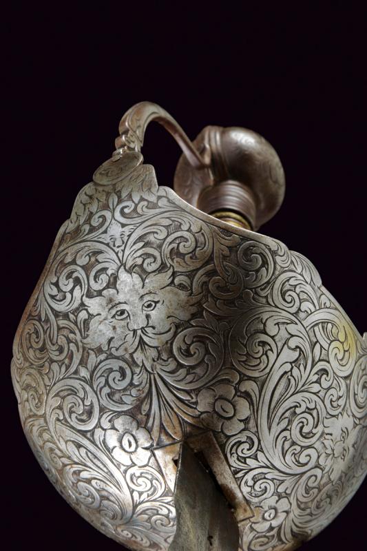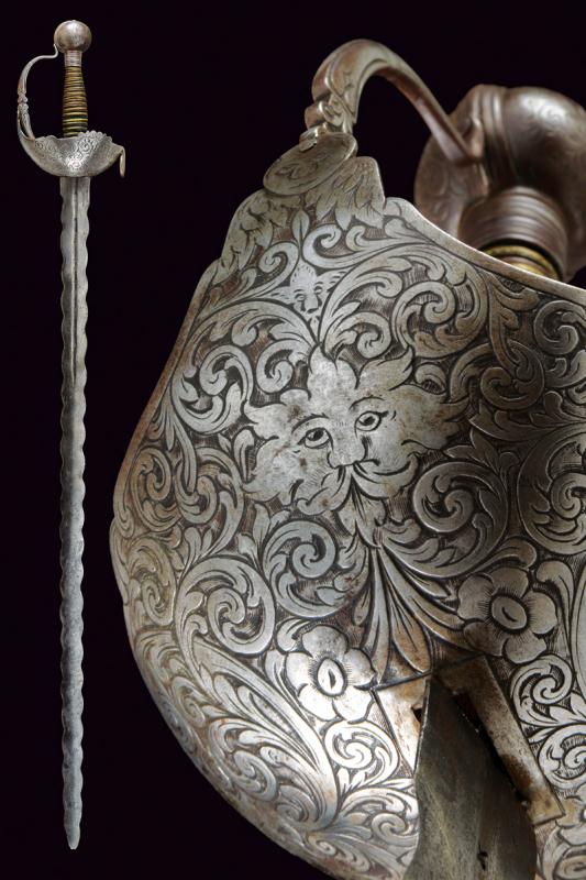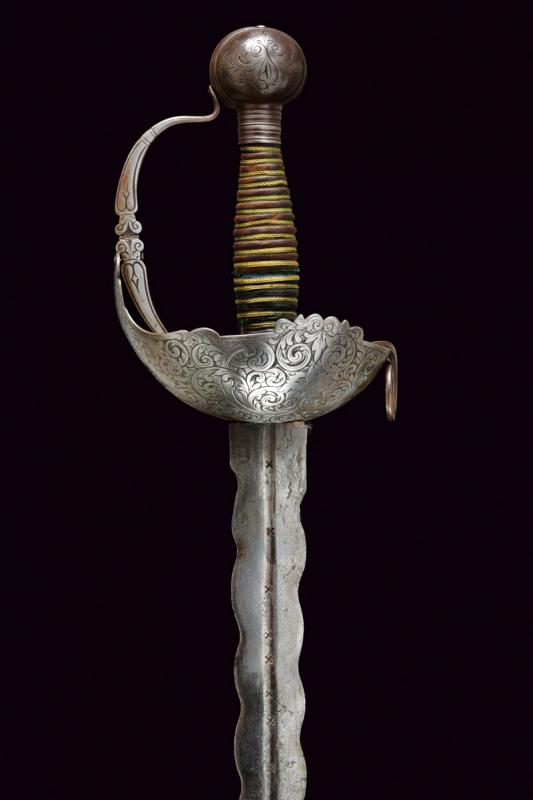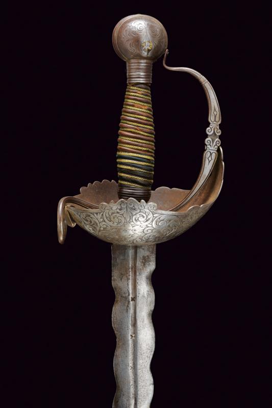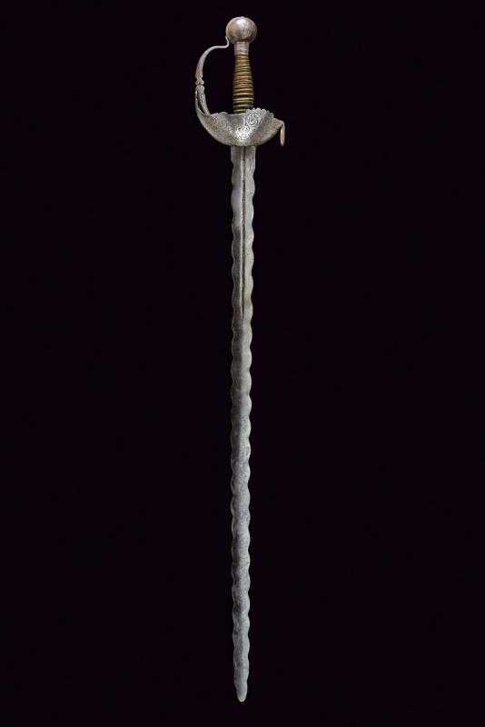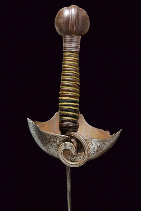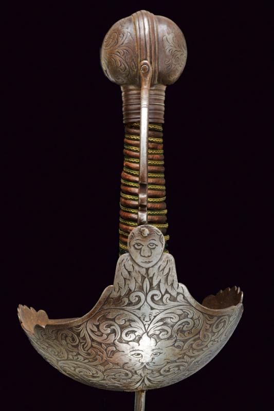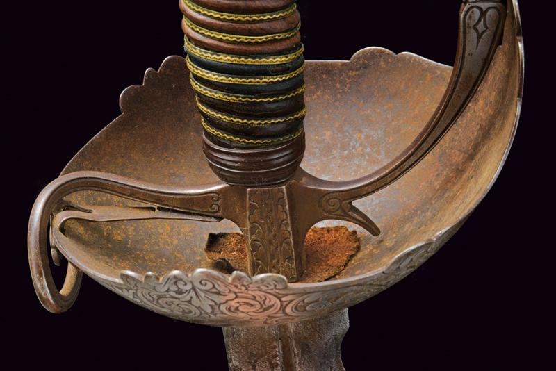 Interessante spada a tazza, datazione: primo quarto del XVIII Sec. provenienza: Spagna, Lama dritta a due fili ondulati, la base con scanalatura recante punzoni a 'X'. Fornimento in ferro con coccia asimmetrica finemente incisa con tre mascheroni tra fiorami, il bordo con intagli. Il braccio dell'elso lavorato a serpente, massello rettangolare ed inciso, ramo di guardia intagliato ed inciso. Grande pomo cavo, ovale, inciso e rilevato al centro. Impugnatura in legno a spire con resti di rivestimento in cuoio e trecciola metallica. Rara. lunghezza 103 cm.