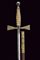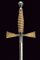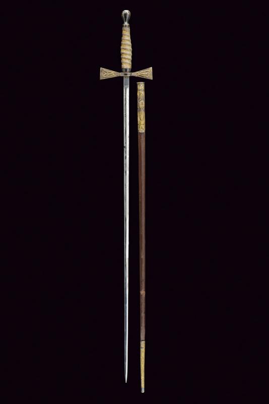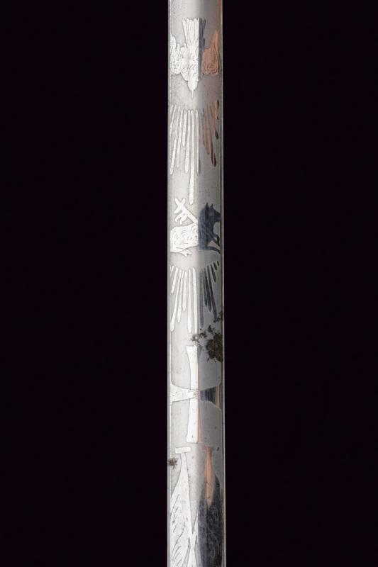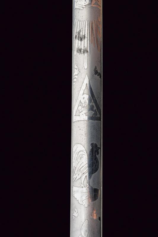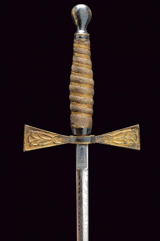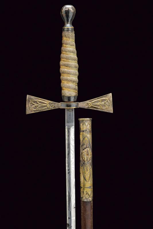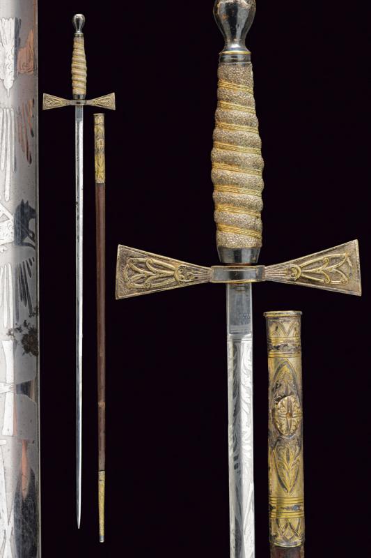Bello spadino da massone , datazione: Fine del XIX Secolo provenienza: Europa, Lama a due fili di sezione lenticolare con tallone rettangolare. La prima parte incisa con colomba, croce, leone di Giuda, triangolo con teschio, gallo e bandiere. Fornimento in argento parzialmente dorato, l'impugnatura lavorata a fingere la trecciola. Fodero di cuoio con fornimenti in argento finemente decorato en suite. lunghezza 94 cm.