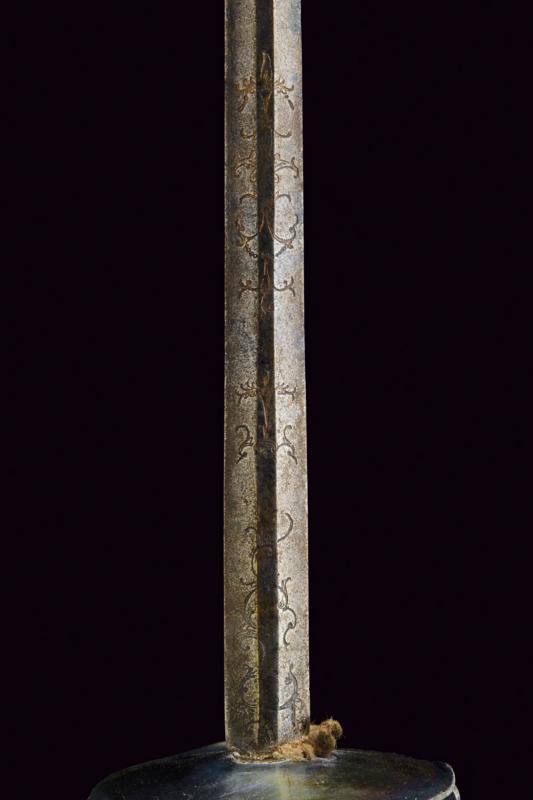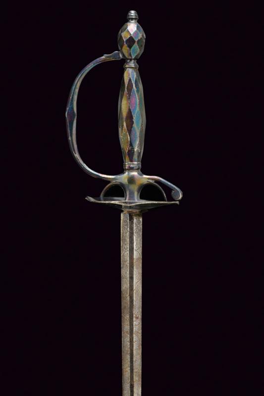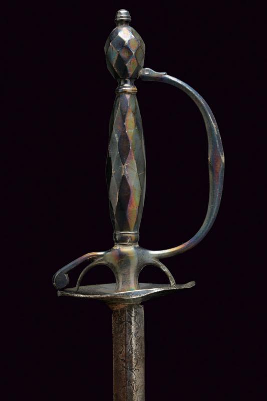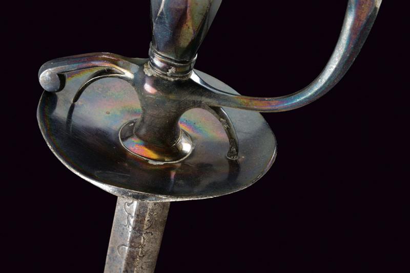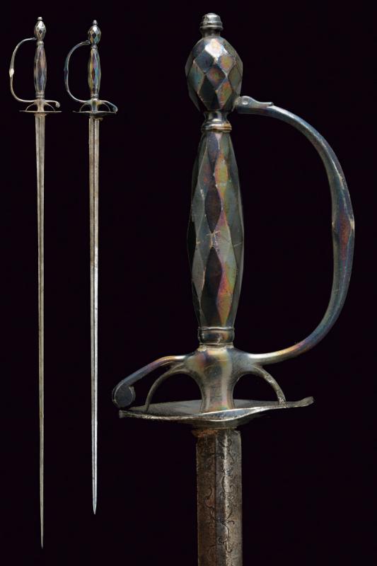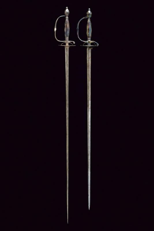 Lotto di due spadini con fornimento in argento, datazione: primo quarto del XIX Sec. provenienza: Europa, Uno con lama triangolare, l'altro con lama esagonale e incisioni floreali; entrambi con fornimento in argento massiccio (entrambi con vari punzoni) con pomo ed impugnatura faccettata. lunghezza 89-96 cm.
