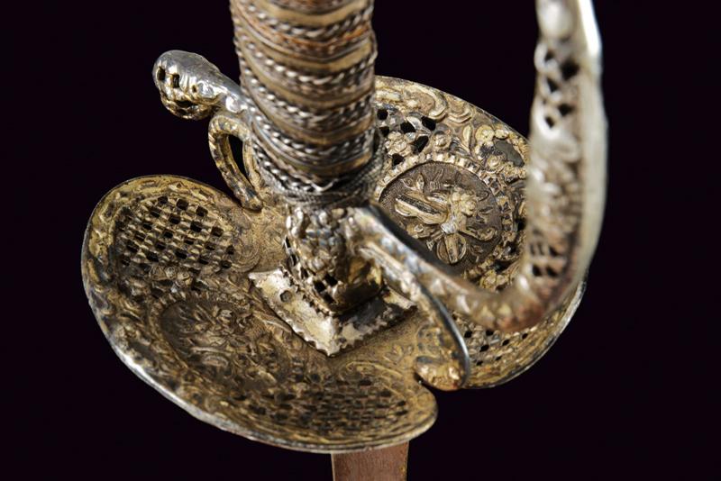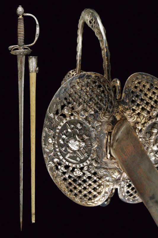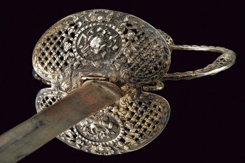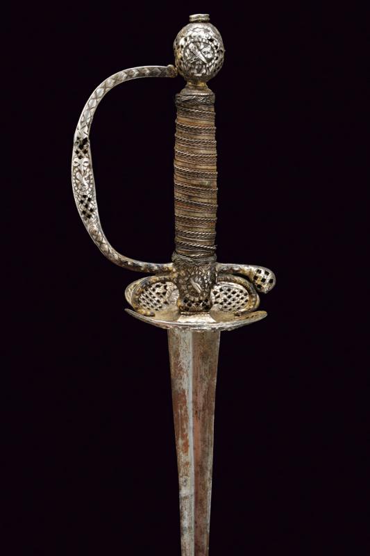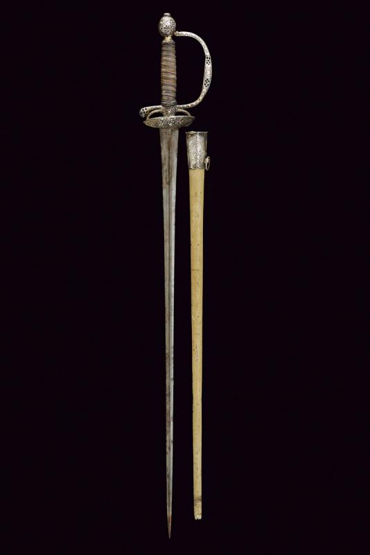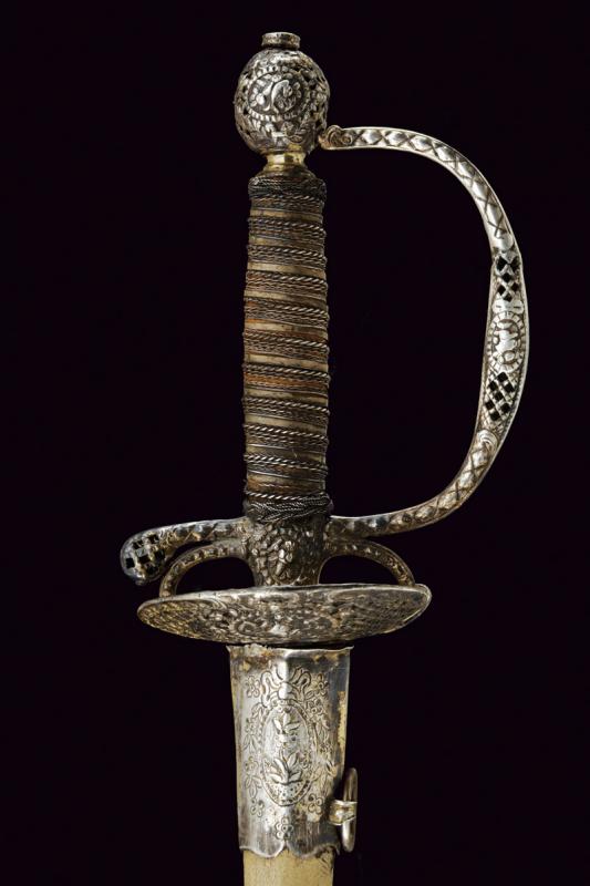 Spadino da mancino, datazione: fine del XVIII Sec. provenienza: Francia, Corta lama di sezione triangolare con facce incavate. Fornimento in argento, finemente inciso e traforato a motivi floreali. Impugnatura in legno rivestito di trecciola e teste di moro. Fodero in legno rivestito di pelle bianca con cappa in argento decorato en suite, puntale mancante. Piccoli danni. lunghezza 77.5 cm.