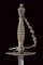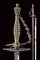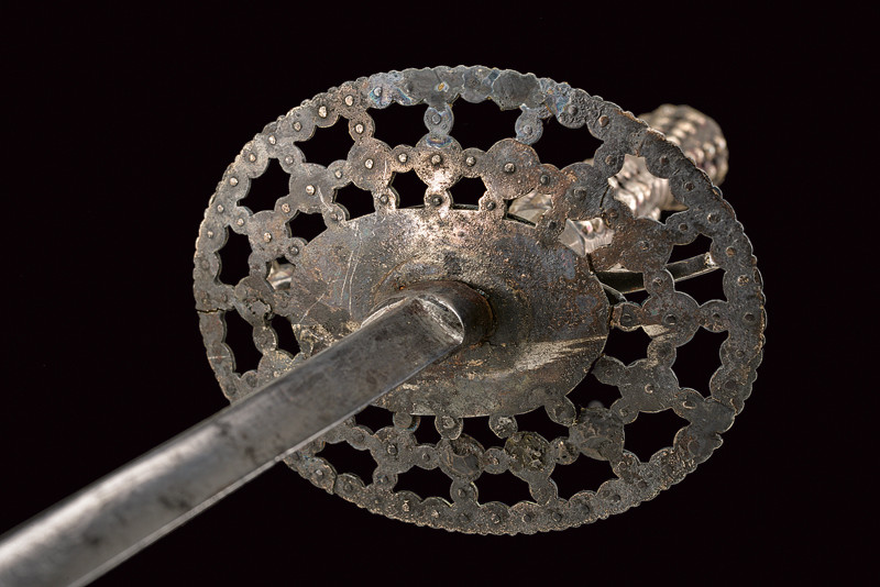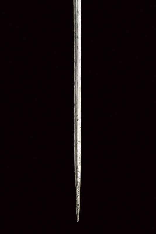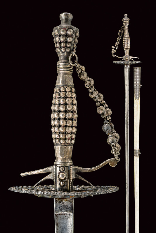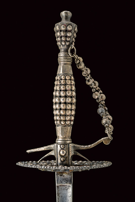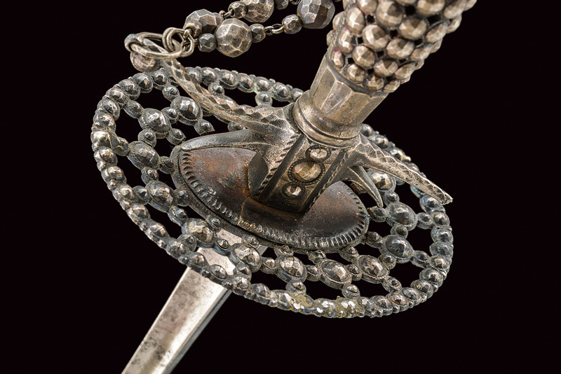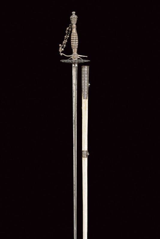 Spadino, datazione: 1800 circa provenienza: Francia, Lama dritta di sezione triangolare, la prima parte con resti di incisioni floreali; fornimento in ferro decorato in perle d'acciaio (piccola mancanza a un braccio) completo di catenella; fodero laccato di bianco con fornimenti in ferro decorato a righe. lunghezza 98 cm.