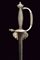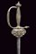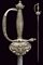 Spadino da corte con fornimento in argento, datazione: Prima metà del XIX Secolo provenienza: Spagna, Lama di sezione lenticolare con resti di decorazioni ed iscrizioni alla base. Fornimento in argento massiccio, pelta con stemma reale spagnolo fra decorazioni floreali in rilievo e su fondo granulato. Elso, guardia e pomo decorati a motivi floreali, impugnatura a spire. lunghezza 92 cm.