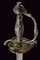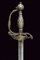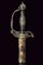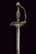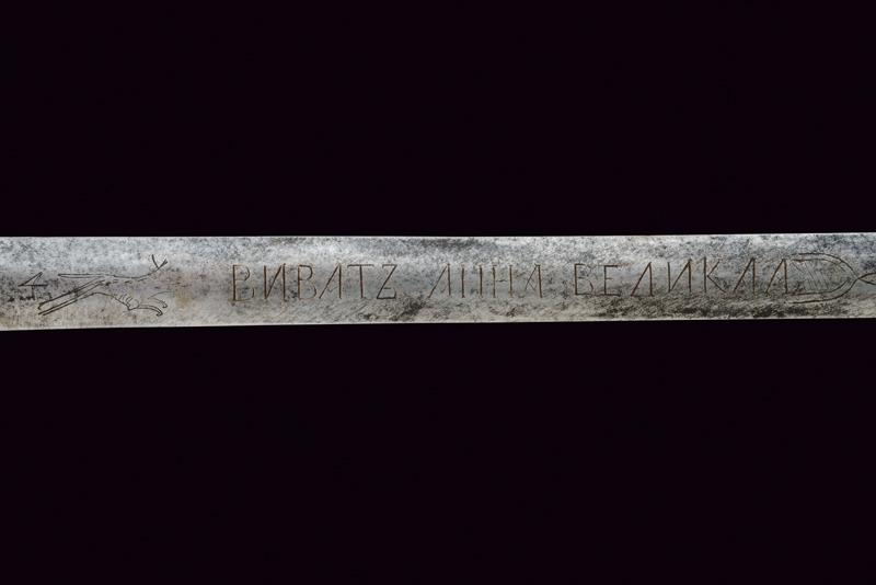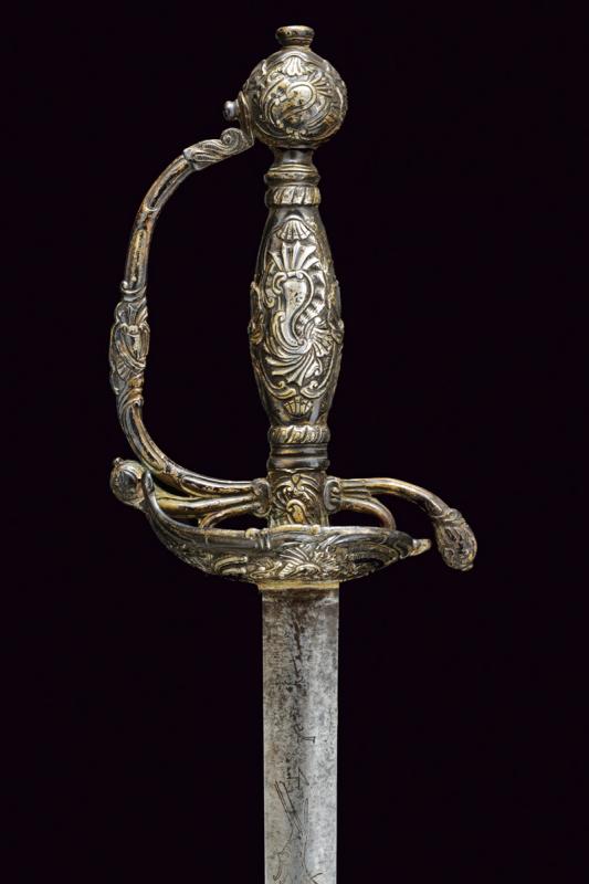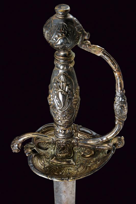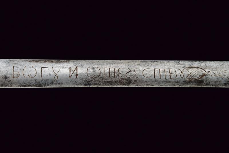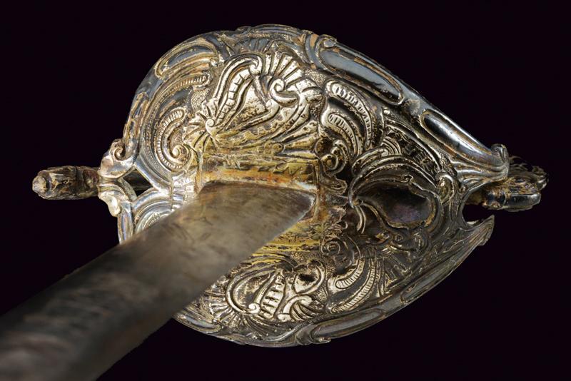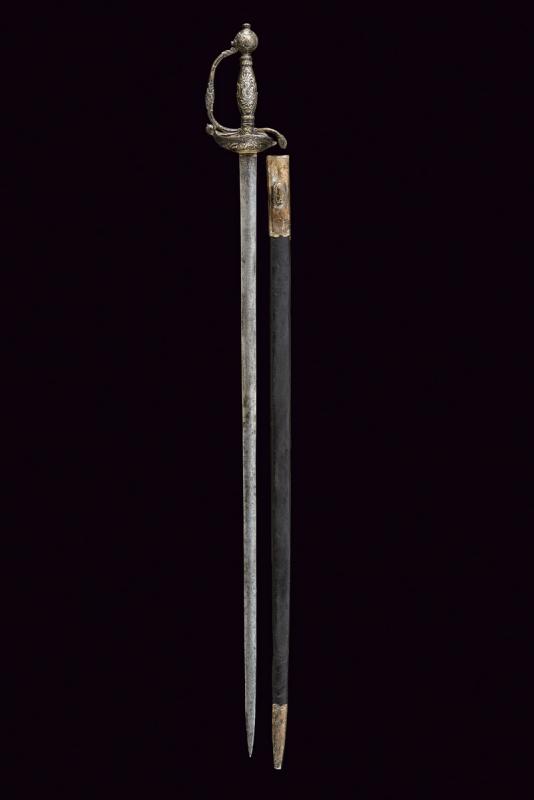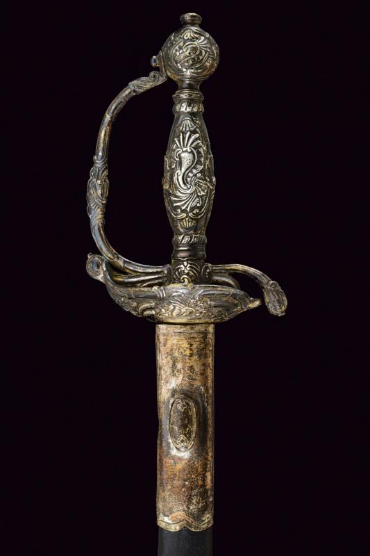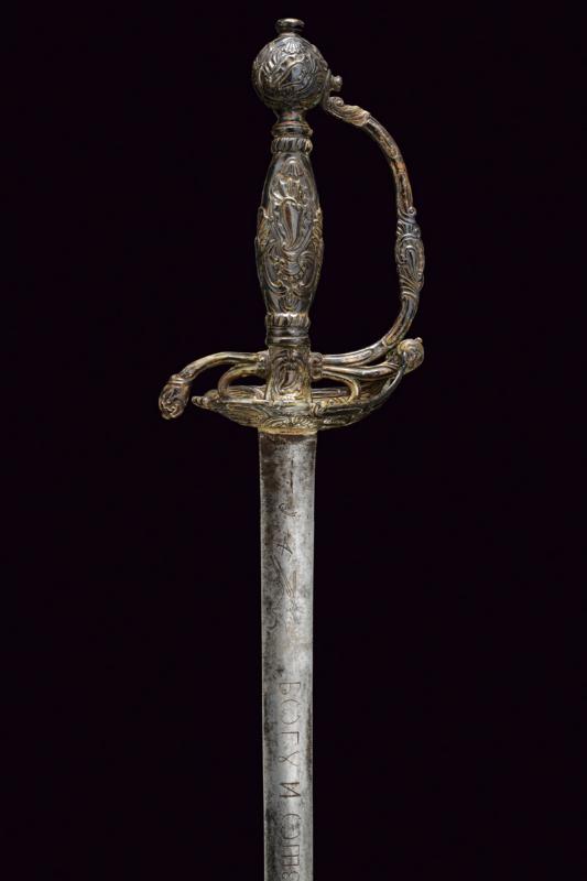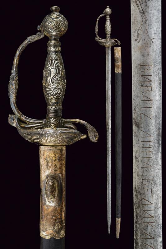 Spadino da ufficiale, datazione: XVIII Secolo provenienza: Russia imperiale, Lama dritta a due fili di sezione lenticolare, recante base numerata '14' e marcata con lupo, iscrizioni in cirillico su entrambi i lati 'VIVA ANNA LA GRANDE' e 'DIO E LA PATRIA'. Fornimento in argento decorato a rocaille. Fodero in cuoio (segni d'usura) con fornimenti in argento. In patina scura. Raro. lunghezza 107 cm.