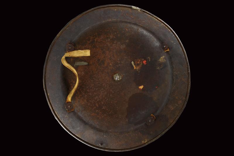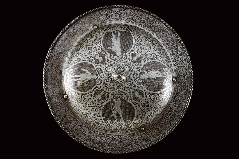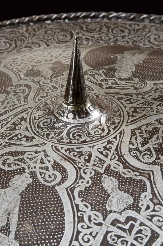Bel brocchiere inciso nello stile del XVI secolo, datazione: Fine XIX inizio XX Secolo provenienza: Europa, Di forma circolare. In ferro. La fascia più esterna piana, l'area centrale convessa e culminante nel brocco centrale (con riparazione) che è di forma conica. La superficie anteriore finemente incisa. Il margine esterno con un'ampia banda di racemi su fondo scuso. L'area centrale con effige di quattro uomini d'arme entro altrettanti cartigli il cui fondo è puntinato. Attorno a queste effigi, bande floreali e ad intreccio e quttro ritratti di re e cavalieri. Il bordo con bel cordone lavorato a fingere il tortiglione. Quattro ribattini in ferro. Sul retro (con resti di vecchia etichetta e sigillo in ceralacca) ancora presente una maniglia in cuoio. diametro 51,5 cm.