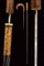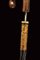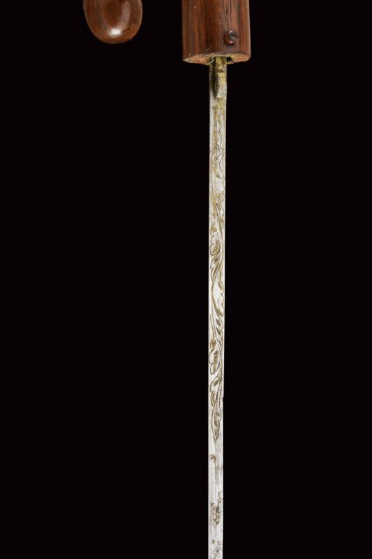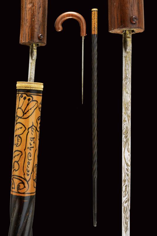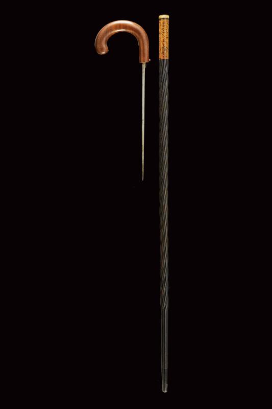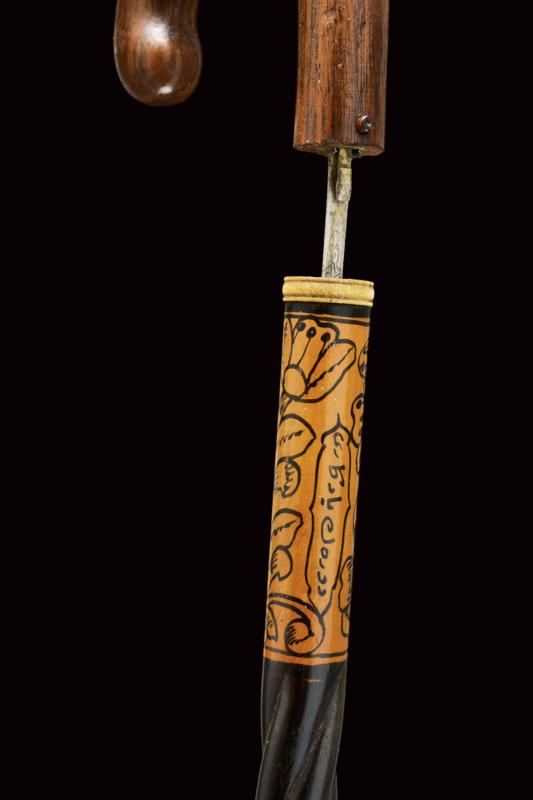 Bastone animato, datazione: 1920 - 1930 provenienza: Francia, Corta e sottile lama da stiletto di sezione triangolare, la fascia superiore con incisioni floreali. Impugnatura incurvata in legno con bottone d'apertura. Fusto in legno a spire, la parte superiore in legno chiare dipinto a motivi floreali e con breve iscrizione (firma?). L'imboccatura a disco in corno di cervo lunghezza 36 cm.