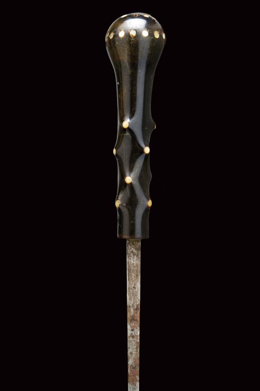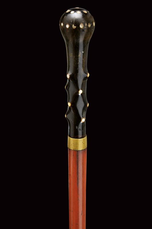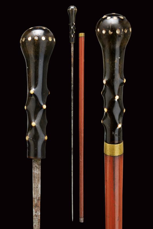 Bastone animato, datazione: 1900 circa provenienza: Francia, Robusta lama di sezione quadra con illeggibili resti di firma. Impugnatura in corno con pomo sferico decorato con intarsi in madreperla (alcune mancanze). Fusto cilindrico in legno con ghiera in ottone e puntale metallico. lunghezza 82 cm.