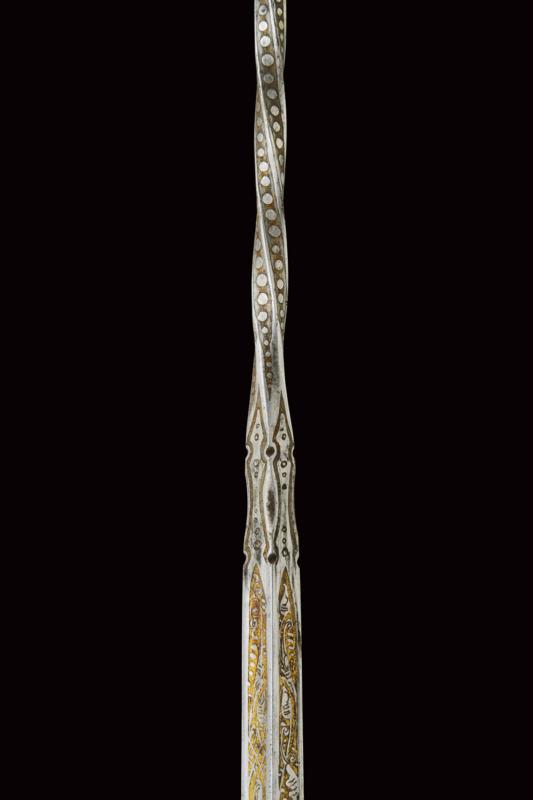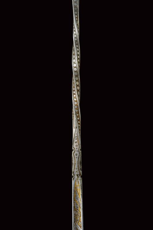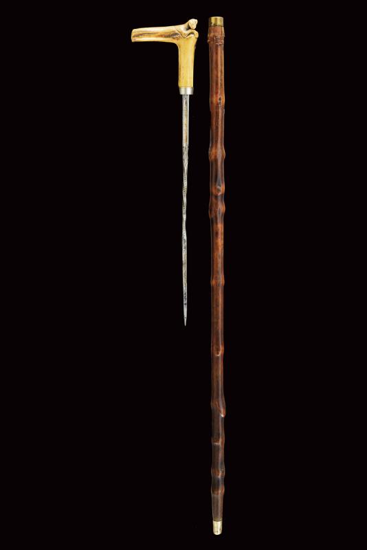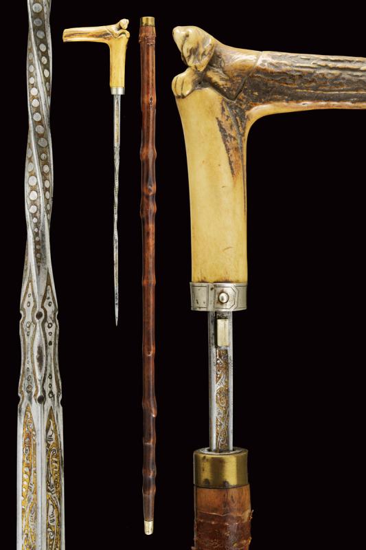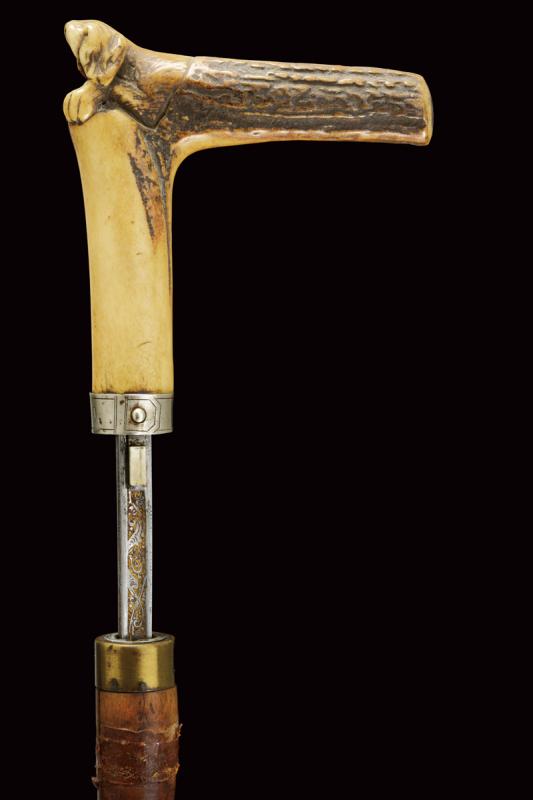 Bastone animato con bella lama, datazione: Fine del XIX Secolo provenienza: Francia, Lama di sezione quadra con facce incavate, la parte centrale a spire, incisa e dorata su quasi tutta la lunghezza a motivi floreali e a liste perlinate. Impugnatura angolata in corno da cervo, all'angolo scolpito con un cane. Ghiera in metallo bianco con bottone d'apertura. Fusto in legno con ghiera e puntale in metallo. lunghezza 46.5 cm.