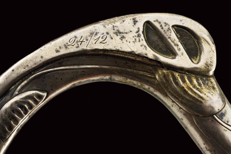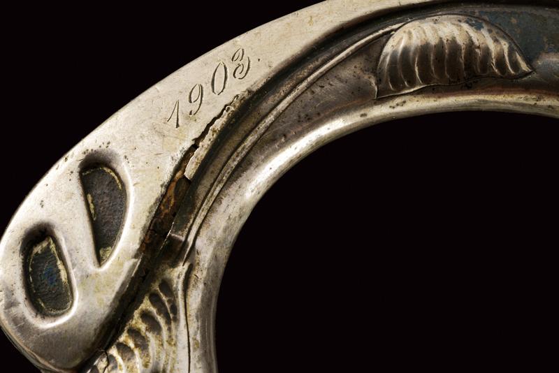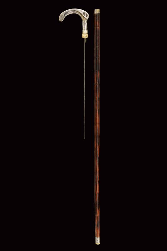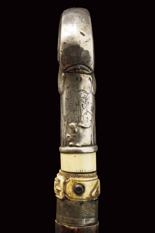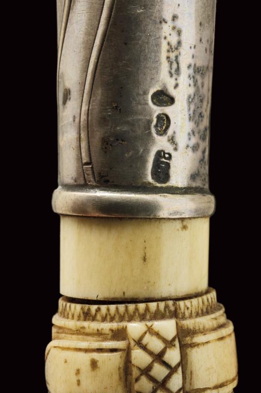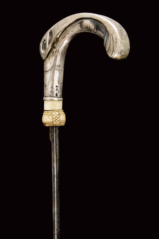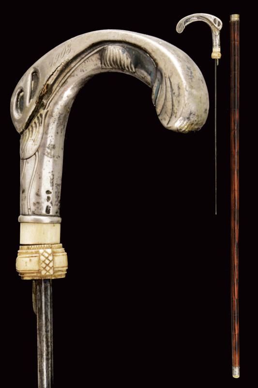Bastone animato, datazione: 1903 provenienza: Europa, Lama dritta a due fili, di sezione esagonale con resti di incisioni a motivi floreali; impugnatura in argento punzonato, di forma incurvata decorata in bassorilievo e recante le date '24/12' su un lato e '1903' sull'altro, al dorso il monogramma 'L'; ghiera in osso intagliata a effigiare un cinturino. Fodero a bastone in legno con puntale e cappa dotati di ghiera in argento. lunghezza 46 cm.