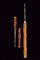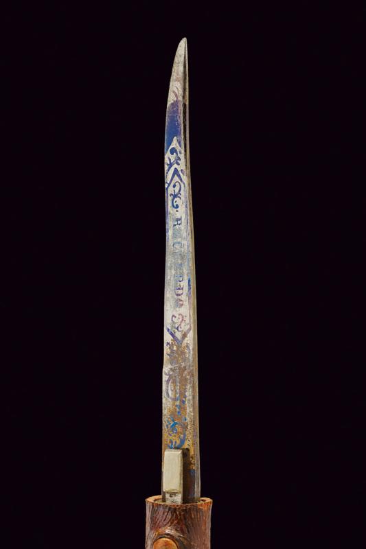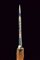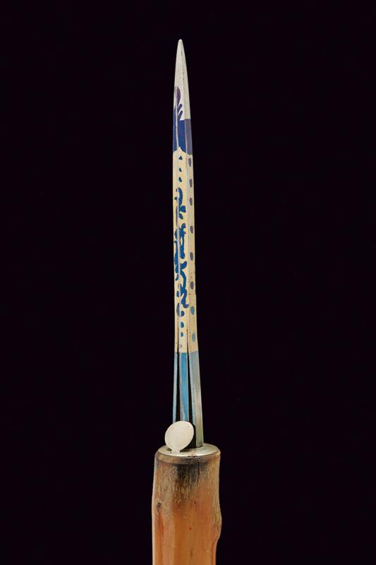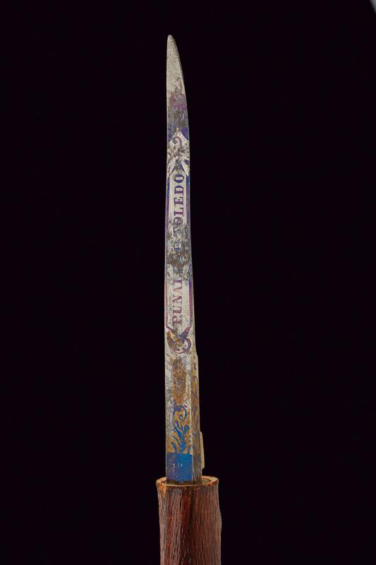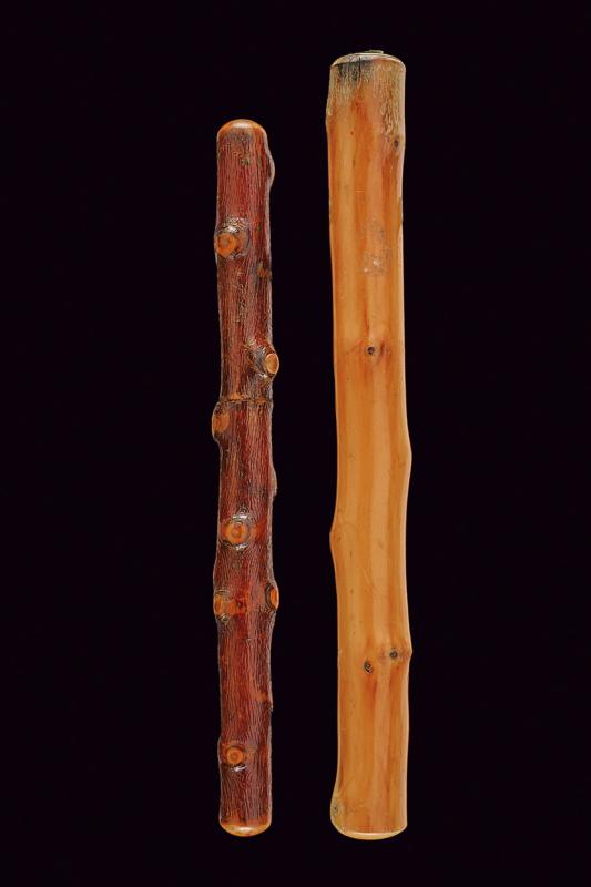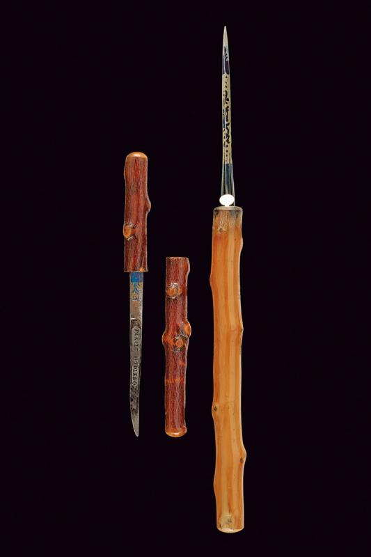 Lotto di due randelli animati, datazione: inizio del XX Sec. provenienza: Toledo, Uno con lama di sezione rettangolare, incisa e dorata su fondo blu con iscrizione 'TOLEDO' e motivi floreali, la base con due ali a molla. Impugnatura in legno. La lama fuoriesce a gravità. L'altro con impugnatura e fodero che imitano il legno, con apertura a bottone, all'interno una lama a un filo brunita con iscrizione 'PUNALE... TOLEDO' e 'RECUERDO'. lunghezza open 19 - 34 cm.