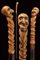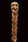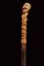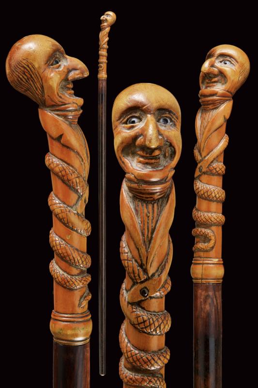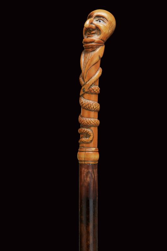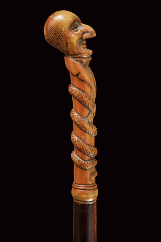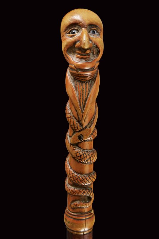 Bastone da passeggio, datazione: 1900 circa provenienza: Germania, L'impugnatura in bosso riccamente scolpita con una testa grottesca al pomo con occhi in vetro, la base cilindrica scolpita con un serpente in altorilievo con occhio in vetro. Fusto in un tipo di legno diverso. lunghezza 88 cm.