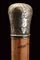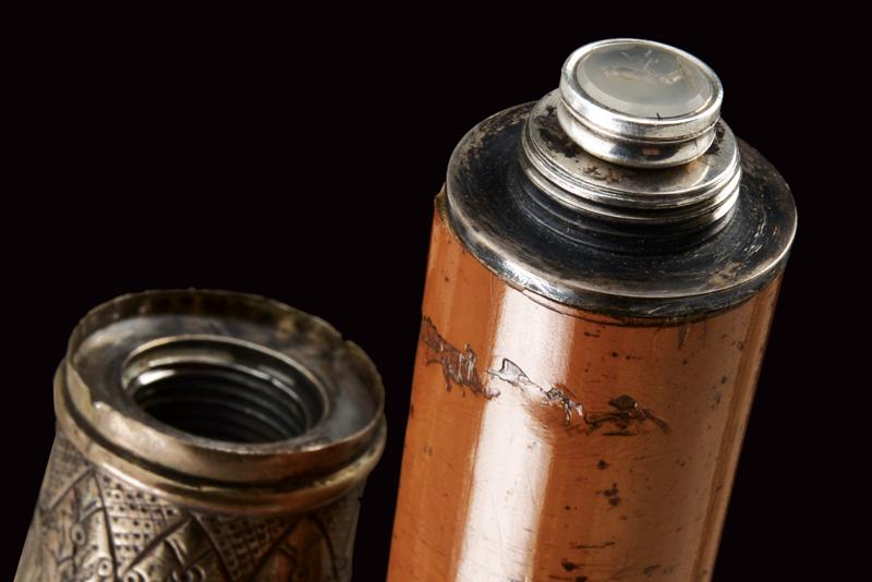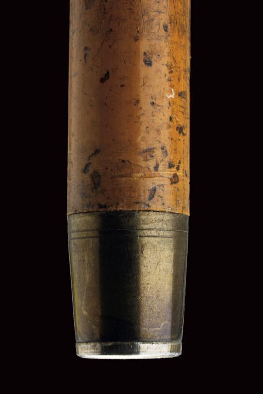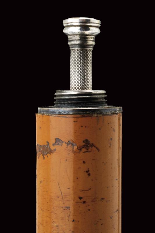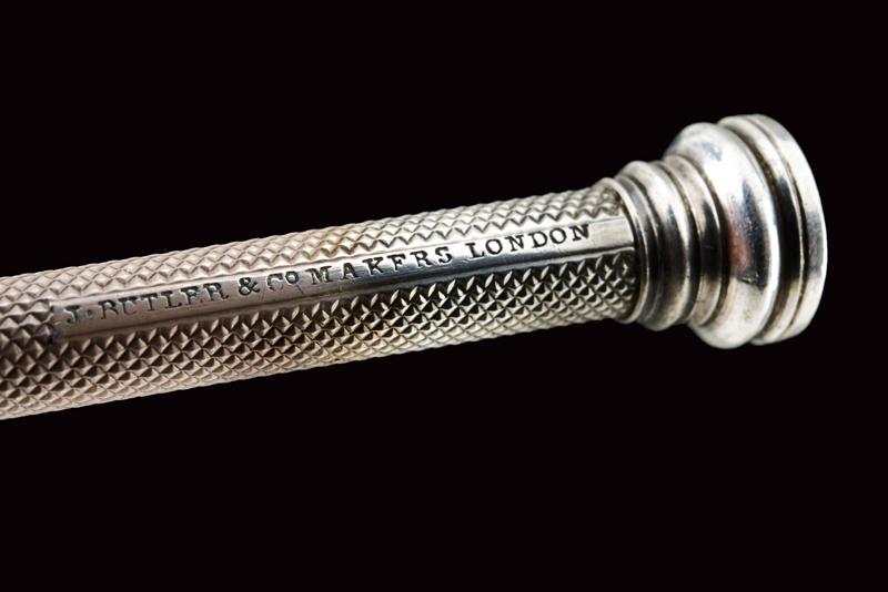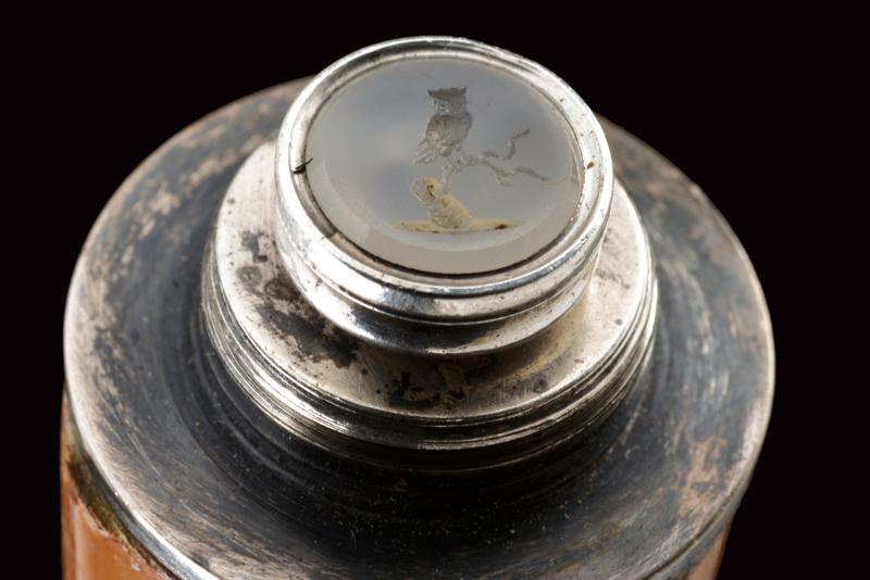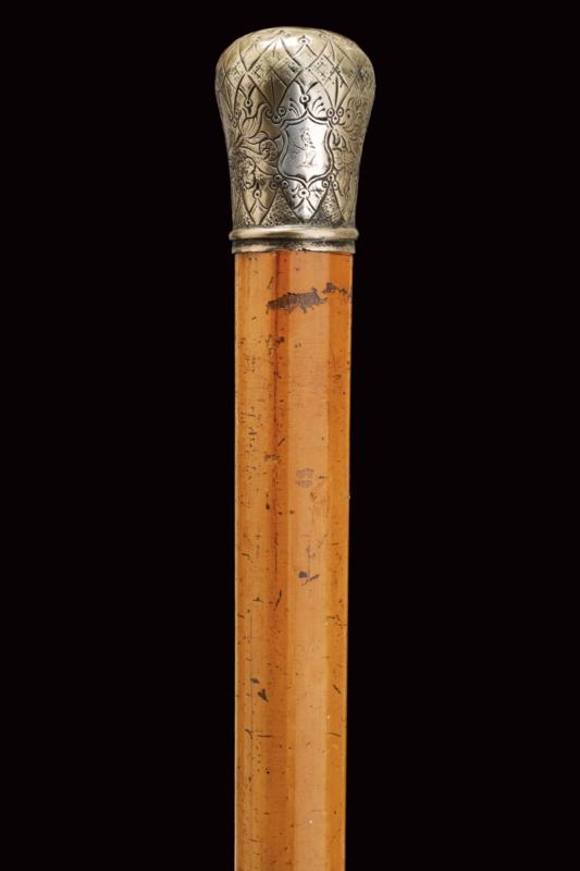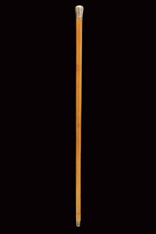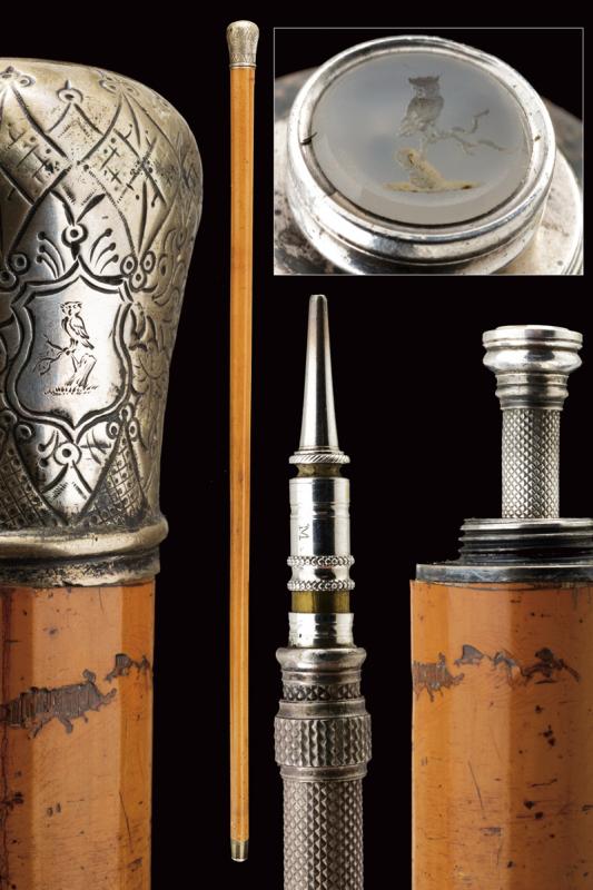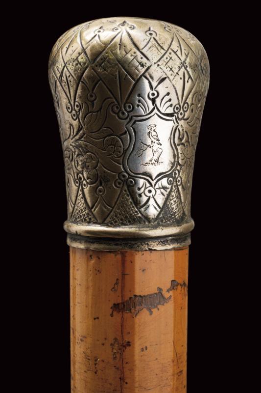 Interessante bastone da passeggio con matita in argento e sigillo, datazione: Fine del XIX Secolo provenienza: Londra, Fusto cilindrico in legno con pomo in argento inciso (segni d'usura), svitabile, all'interno una matita in argento, prolungabile, marcata 'J. RUTLER & Co. MAKERS LONDON', il pomo in pietra dura incisa con un gufo su un ramo. Raro. lunghezza 91.5 cm.