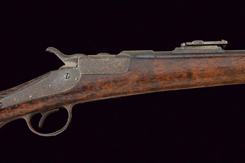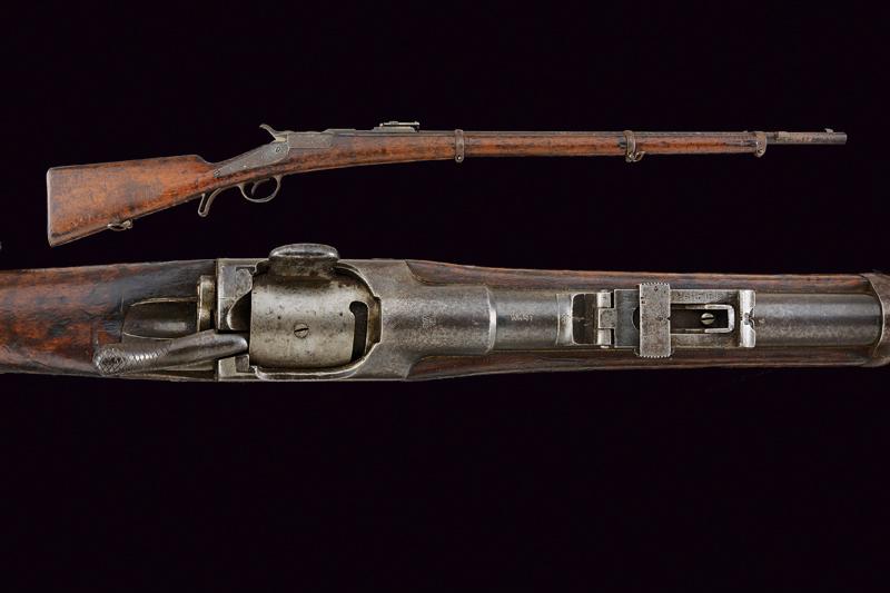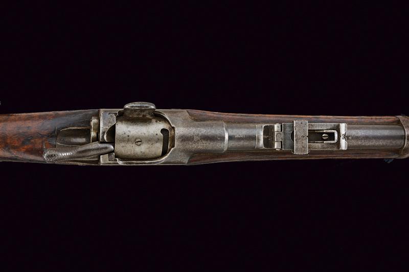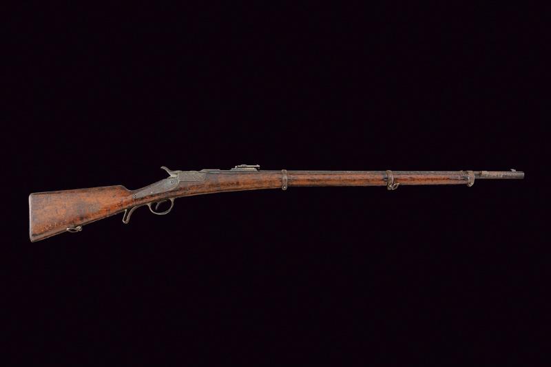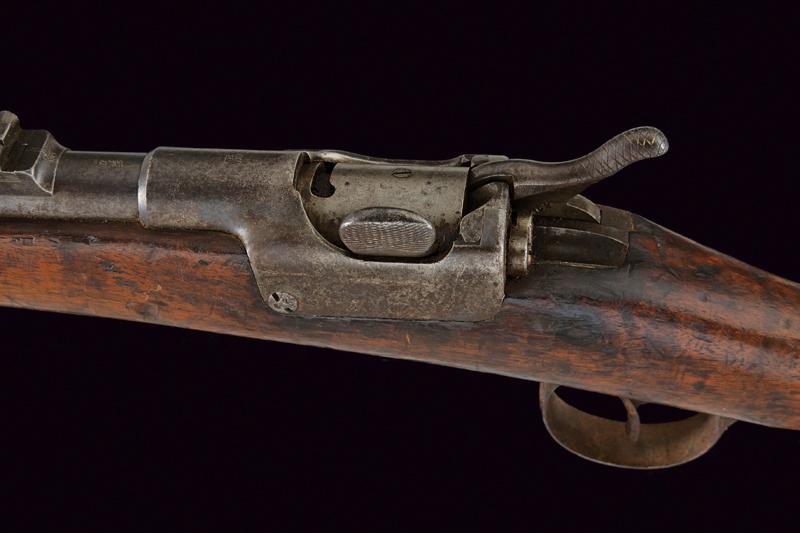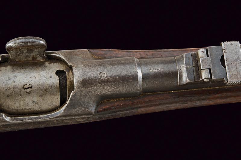 Fucile Werndl Mod. 1873 da fanteria, datazione: 1881 provenienza: Austria, Canna tonda rigata, con mirino, dente d'innesto per baionetta, alzo abbattibile e regolabile, cal. 10 mm. Otturatore girevole, marcato 'Wn81', 'GEWG', sul alzo '3962D' e con punzone imperiale, batteria a molla indietro con cane interno marcata 'GEWG 80'. Cassa in legno (segni di usura). Meccanica funzionante. Fornimenti in ferro, bacchetta mancante. lunghezza 128 cm.