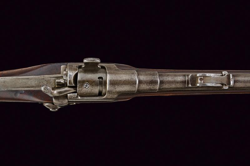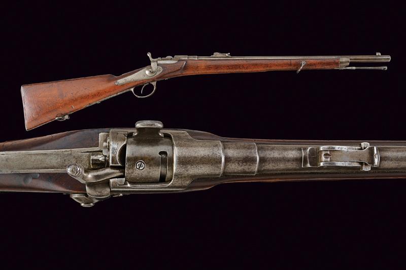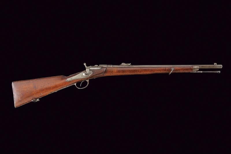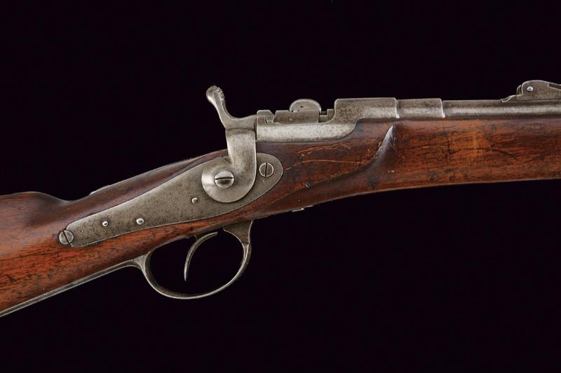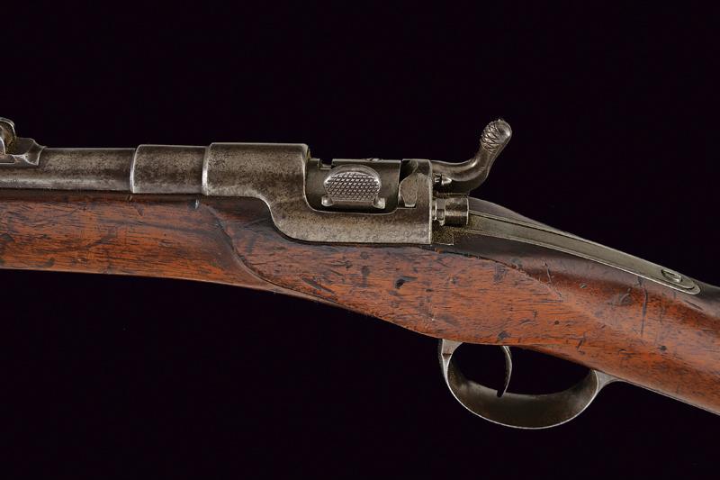 Carabina Werndl Mod. 1867/77, datazione: 1880 circa provenienza: Austria, Canna tonda rigata (anima pulita, rigatura ben visibile, qualche macchia), dotata di mirino, alzo regolabile, cal. 11 mm. Otturatore a blocco rotante funzionante. Batteria con meccanica funzionante. Cassa intera in legno. Fornimenti e bacchetta in ferro. Canna senza marcature, sulla cartella piccolissimi resti di data e punzone imperiale. lunghezza 98 cm.