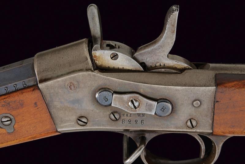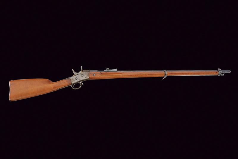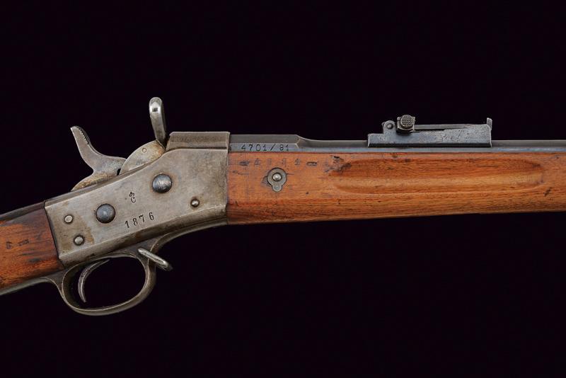 Fucile Carl Gustav Mod. 1867/89 rolling block, datazione: 1889 provenienza: Svezia o Norvegia, Canna tonda rigata, dotata di mirino, dente d'innesto per baionetta, alzo abbattibile e regolabile, recante punzone a 'C' coronato, marchi 'O.G.' e 'G.M.', con matricola e altre numerazioni, Cal. 8mm in volata. Anima pulita, rigatura visibile. Resti di brunitura antica. Castello con tracce di tartarugatura, recante punzone 'C' coronato, data '1876' matricole su varie componenti coeve alla canna e marcature 'H.A.J.' e 'W.N.'. Meccanica funzionante. Calcio ed astina in legno chiaro recanti vari timbri e numerazioni, matricole coeve. Fornimenti in ferro; due fascette. Bacchetta in ferro. lunghezza 124,3 cm.