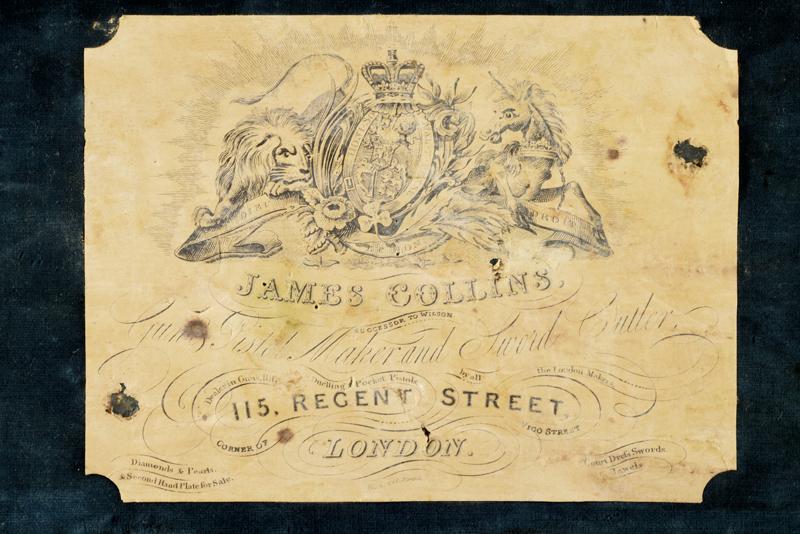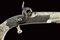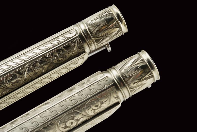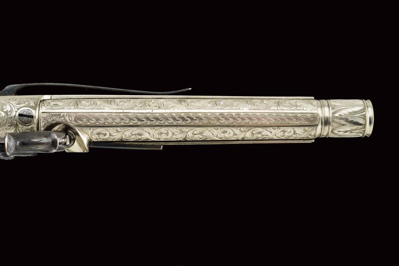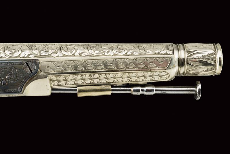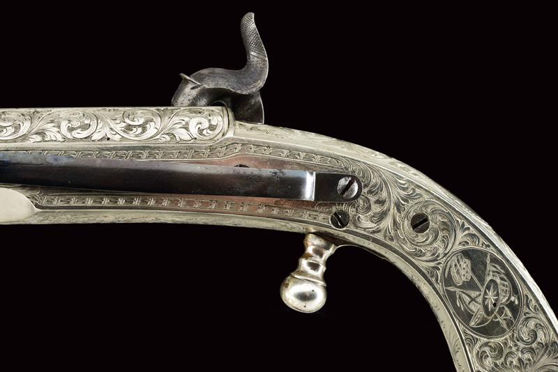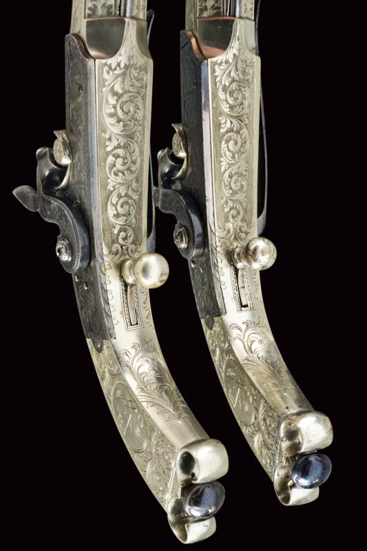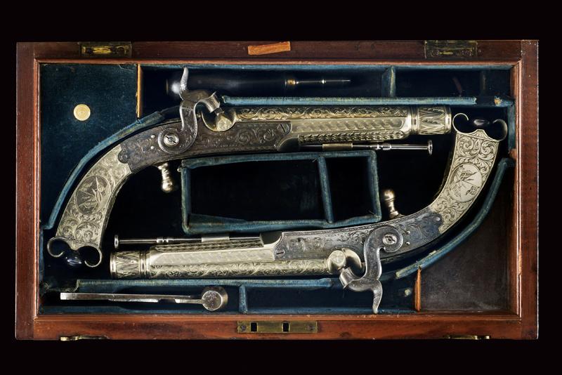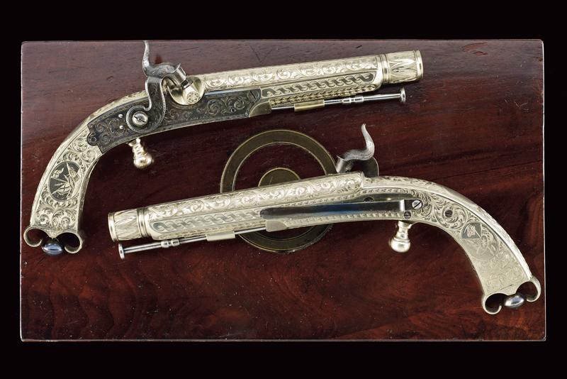 Paio di pistole a luminello in argento di Campbell in cassetta, datazione: 1840 circa provenienza: Scozia, Canne lisce a due ordini in argento, riccamente incise a motivi floreali e geometrici, cal. 11 mm; batterie e cani in ferro, con cartelle firmate 'CAMPBELL' e finemente incise a motivi floreali. Casse intere in argento decorato en suite, i calci decorati a trofei, tipiche cocce aperte, con bottone al centro, in ferro brunito. Grilletti a sfera. Ganci da cintura e bacchette in ferro. In cassetta antica in legno (piccoli danni e mancanze) foderata di velluto con etichetta di James Collins di Londra, munita di cacciavite e fondipalle. Raro ensamble. lunghezza 26 cm.