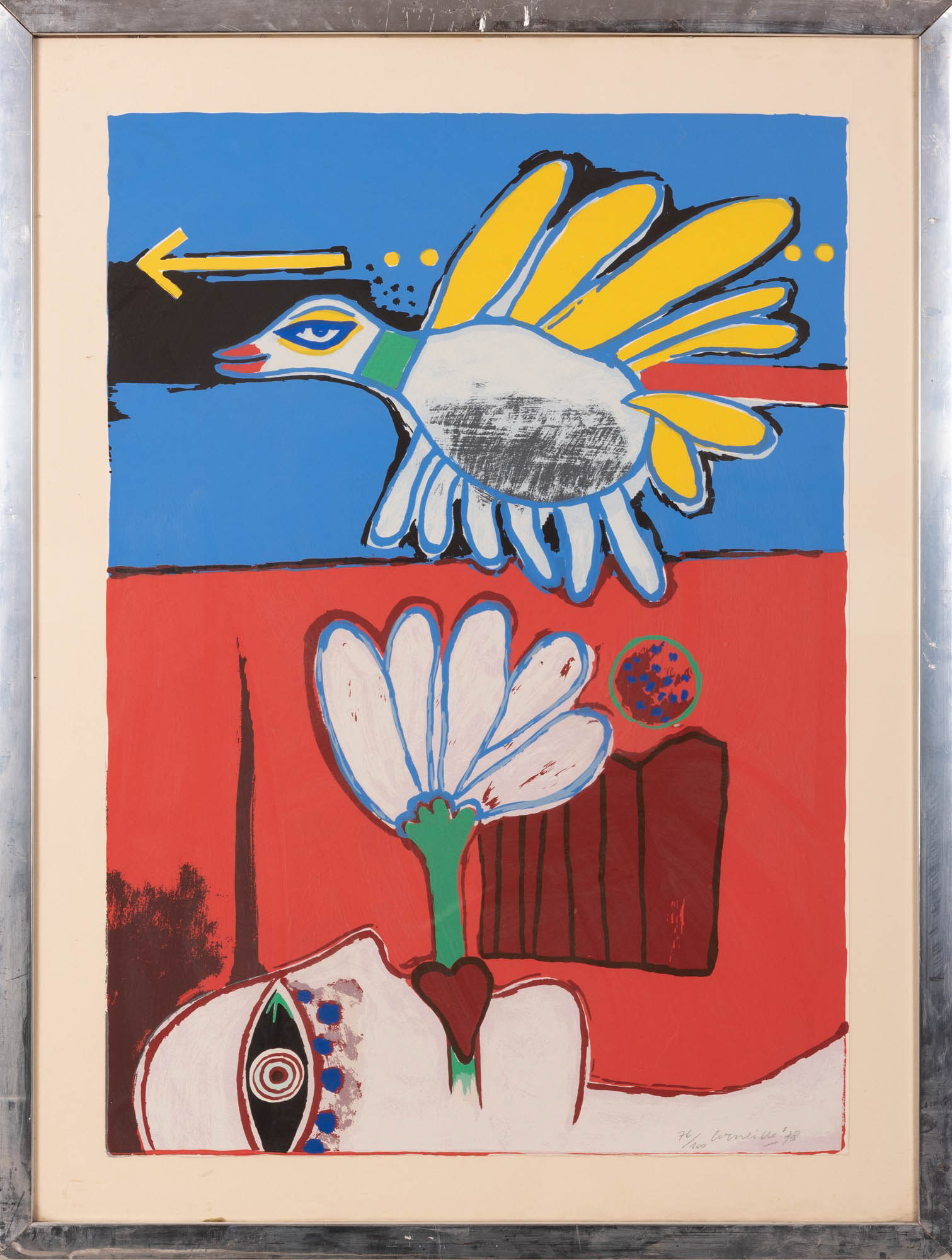 Guillaume Corneille (Liegi, 1922 - Auvers-sur-Oise, 2010) Composizione con figura femminile, fiore e uccello Serigrafia 80x60 cm e 85x65