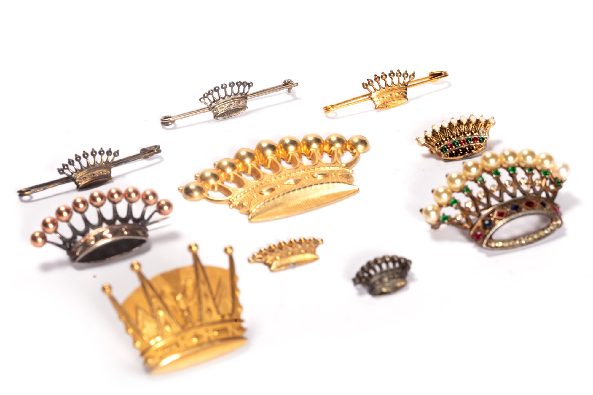 Lotto composto da dieci spille e decorazioni a forma di corona, inizi secolo XX