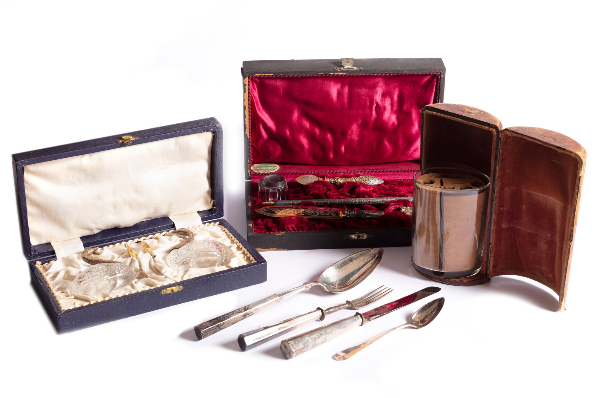 Lotto composto da tre astucci contenenti un servizio da scrittura, un servizio da picnic e un set sale e pepe, secoli XIX - XX