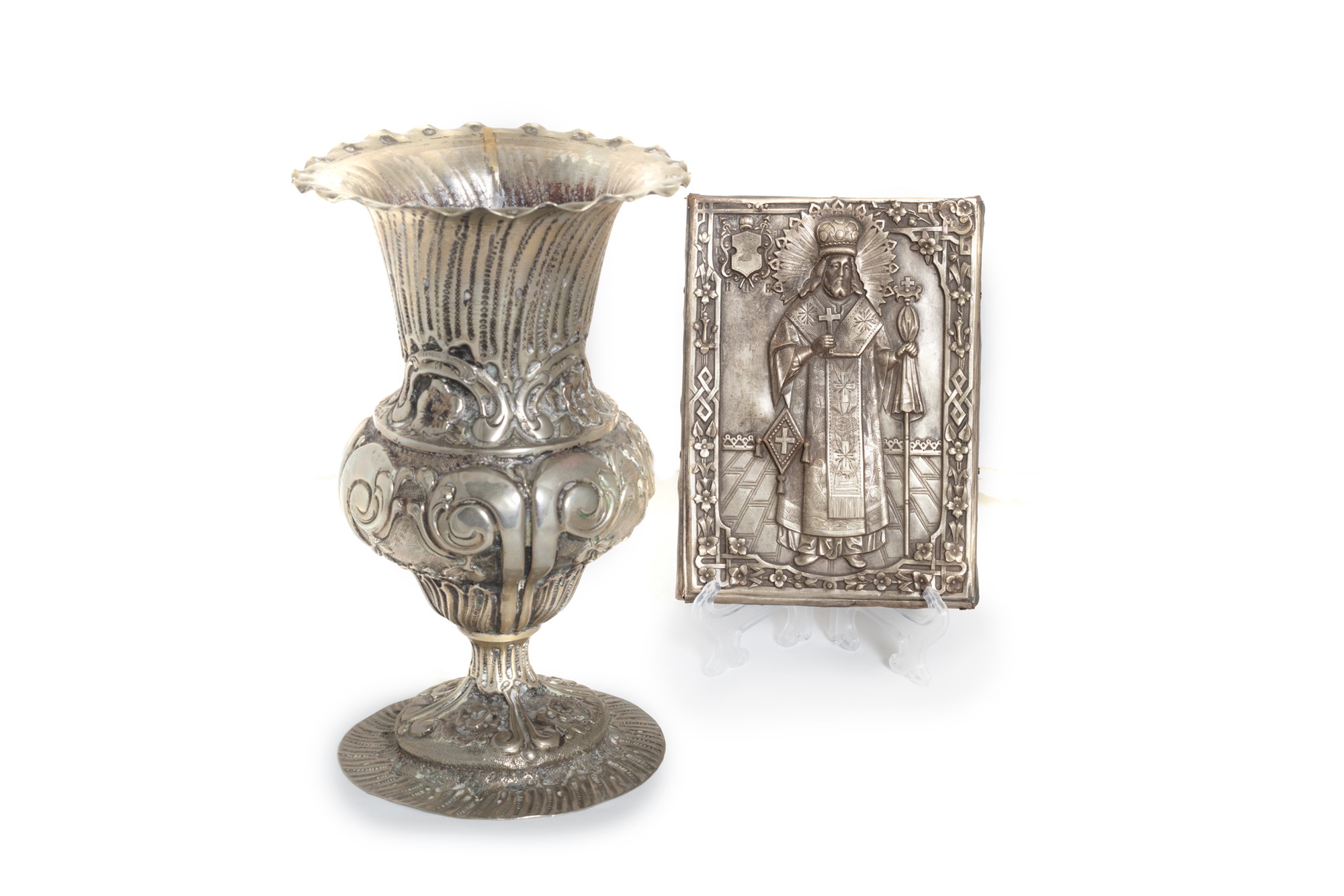 Lotto composto da un vaso e una icona in metallo, secolo XIX