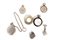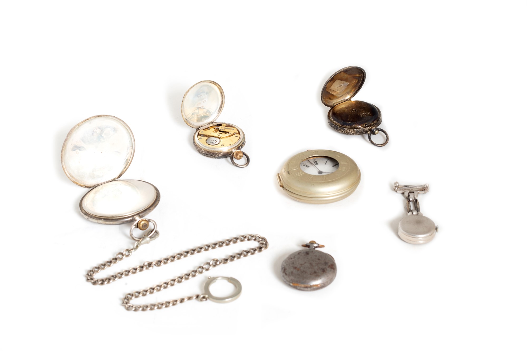 tre in argento, di cui uno non funzionante; due in metallo; uno a spilla in metallo con strasstre in argento, di cui uno non funzionante; due in metallo; uno a spilla in metallo con strass