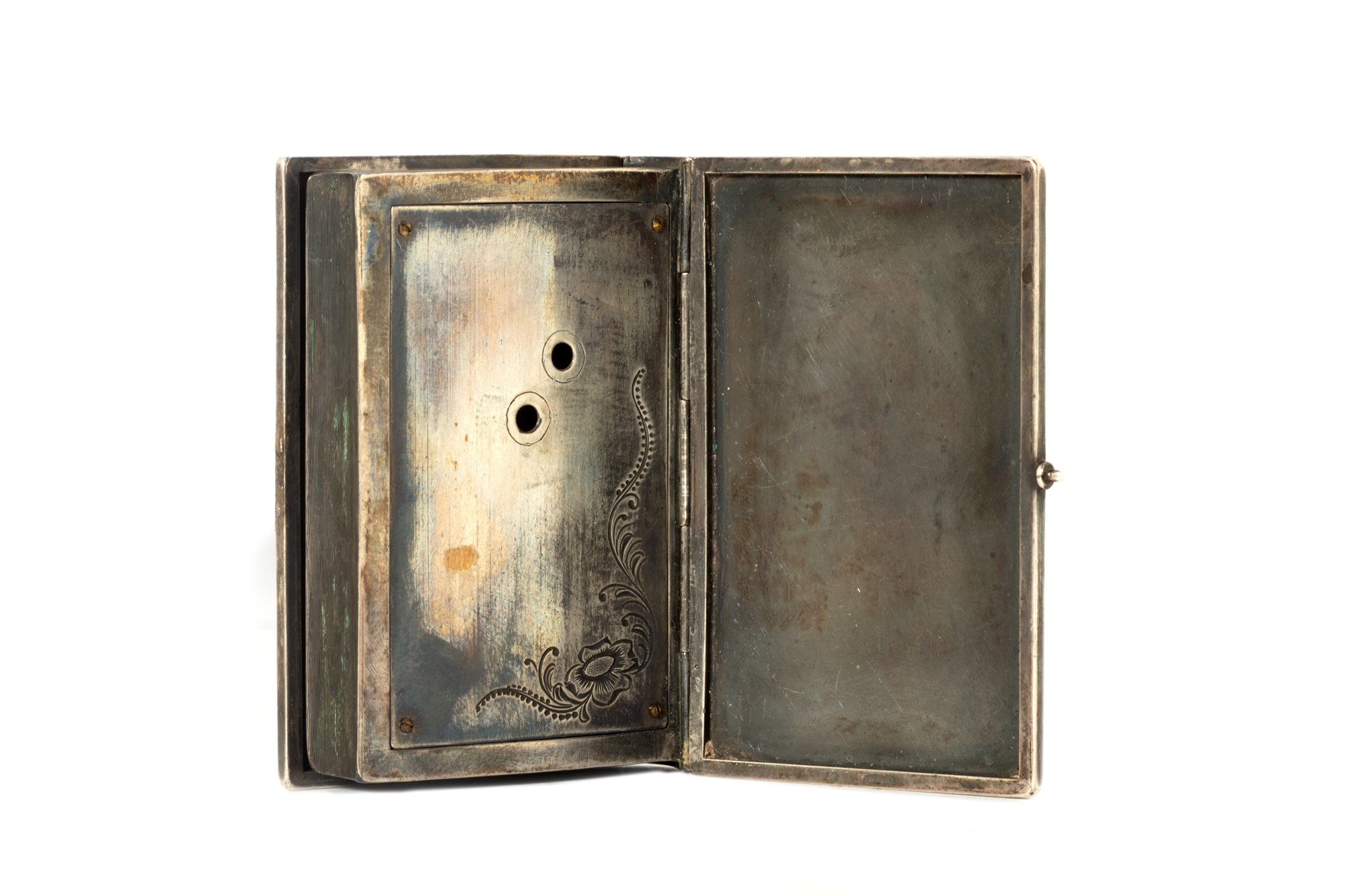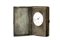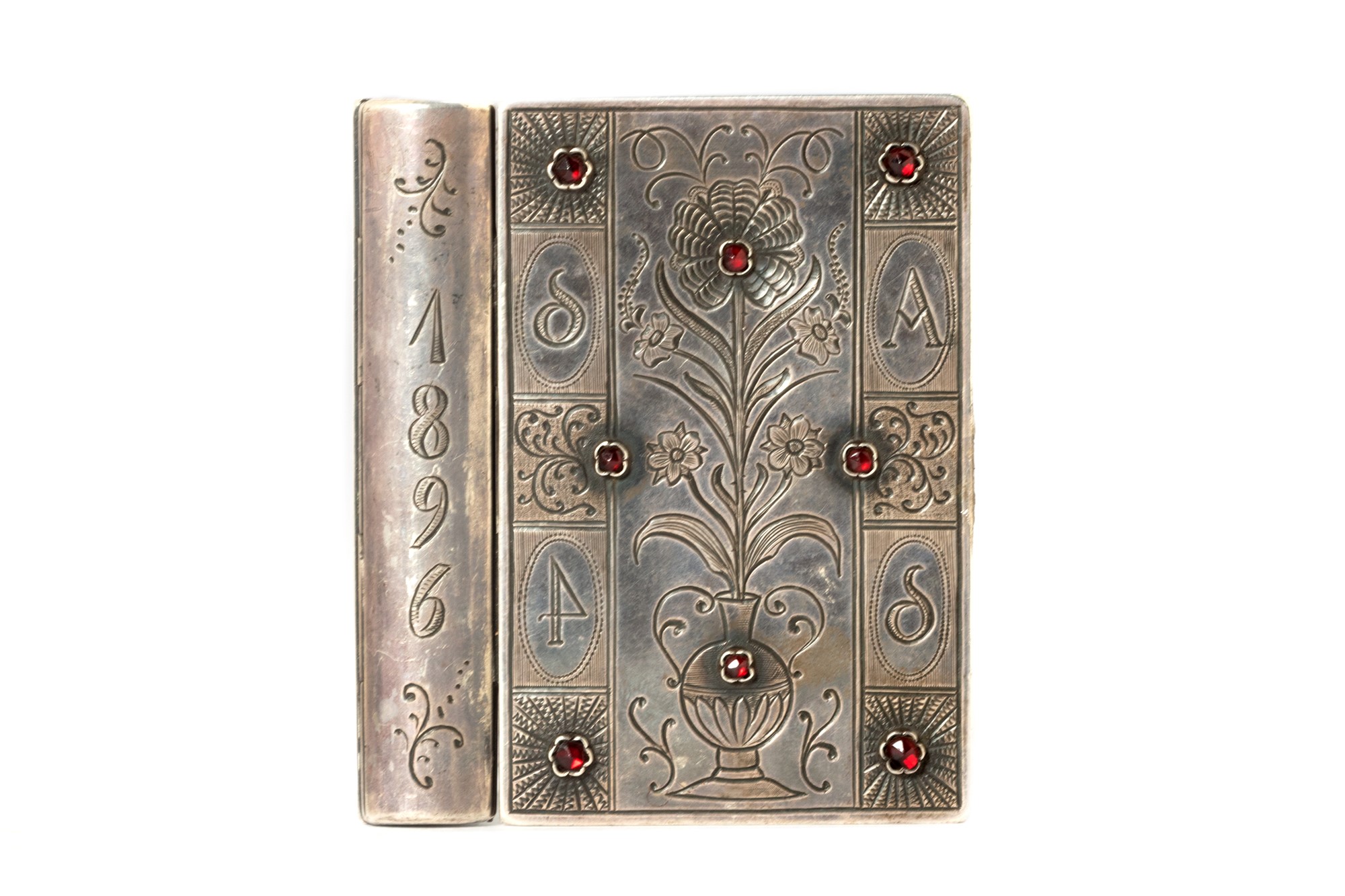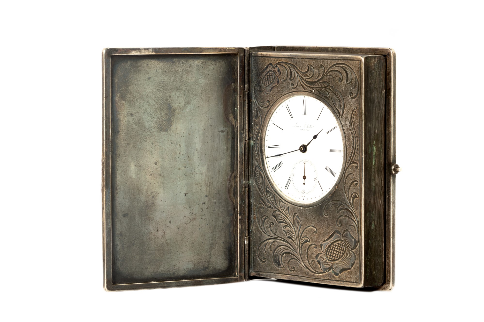 Raro orologio da tasca, entro custodia a forma di libro in argento inciso con granati incastonati sul fronte