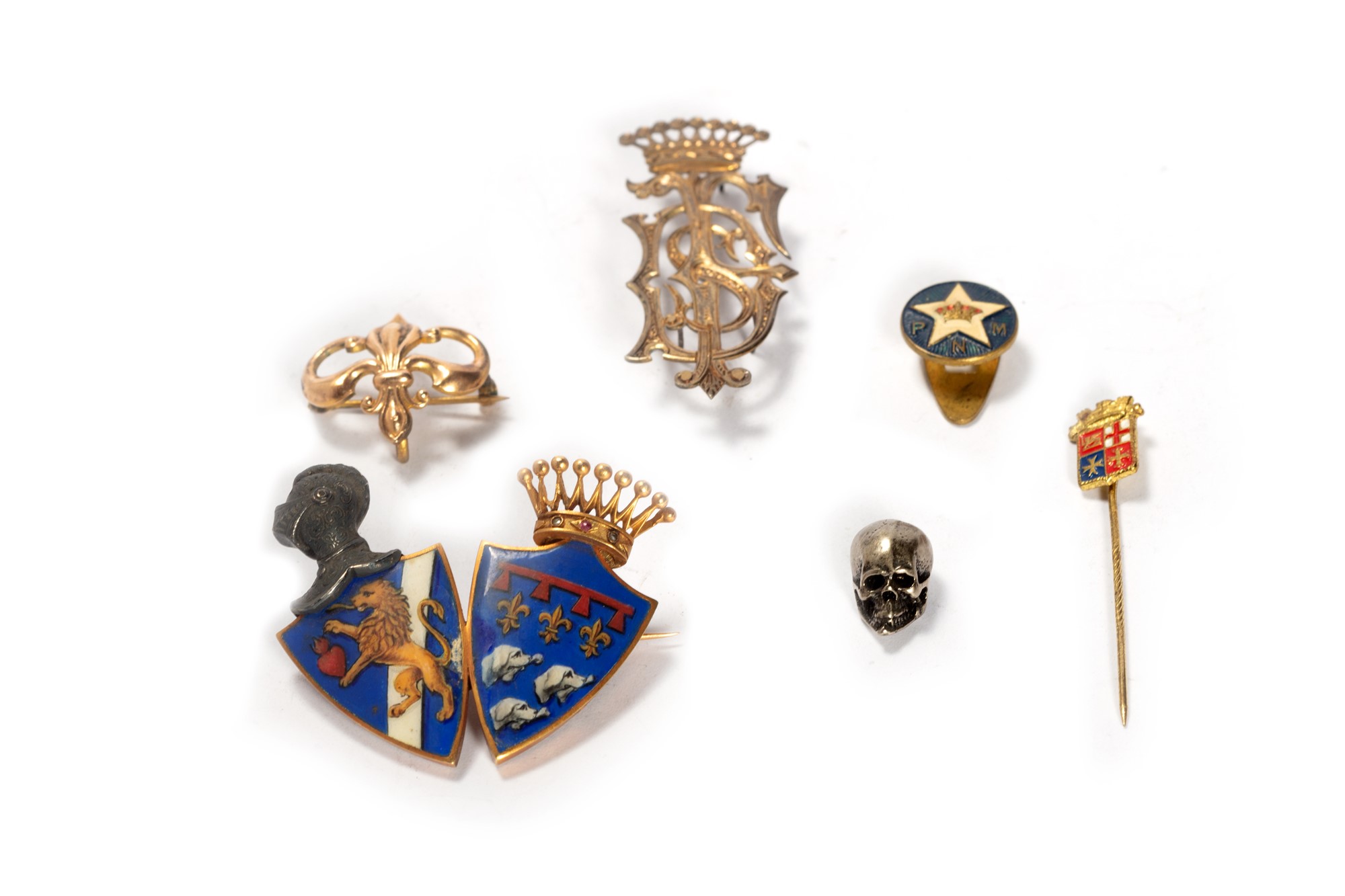una spilla con doppio stemma nobiliare in smalti; un piccolo teschio; una spilla da cravatta; una decorazione con corona e monogramma; una piccola spilla a forma di giglio; e un bottone in smaltouna spilla con doppio stemma nobiliare in smalti; un piccolo teschio; una spilla da cravatta; una decorazione con corona e monogramma; una piccola spilla a forma di giglio; e un bottone in smalto