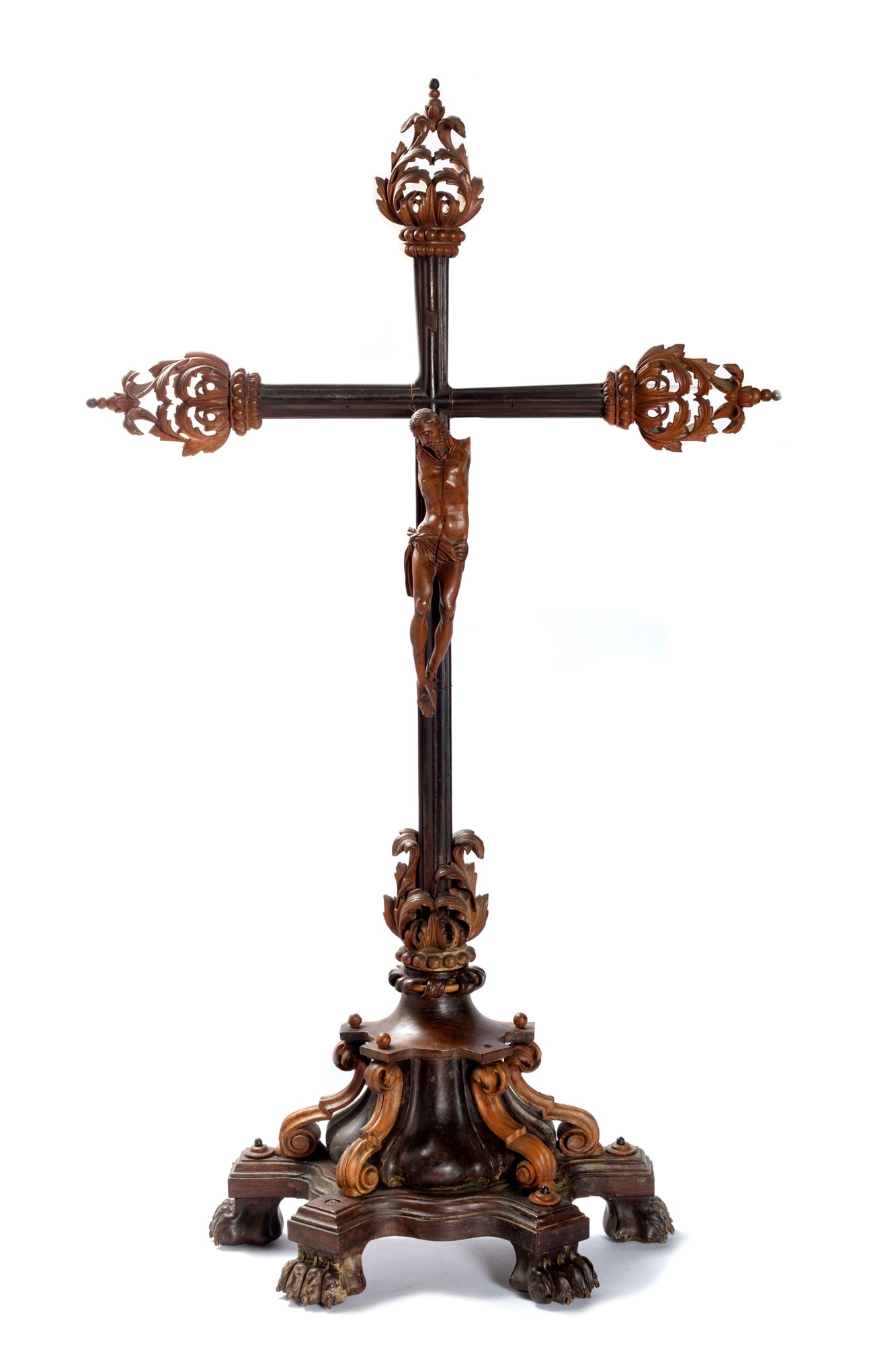 figura di Cristo ed estremità della croce finemente intagliati in legno di bosso; base decorata con volute e piedi ferini