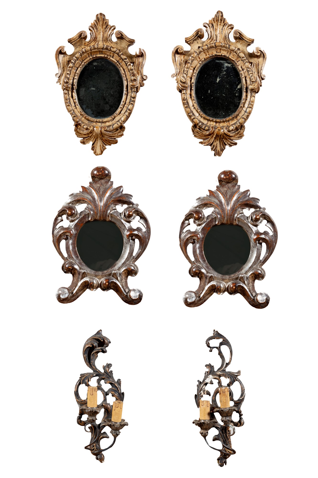 Due coppie di specchierine e una coppia di appliques in legno laccato e a mecca, secolo XX