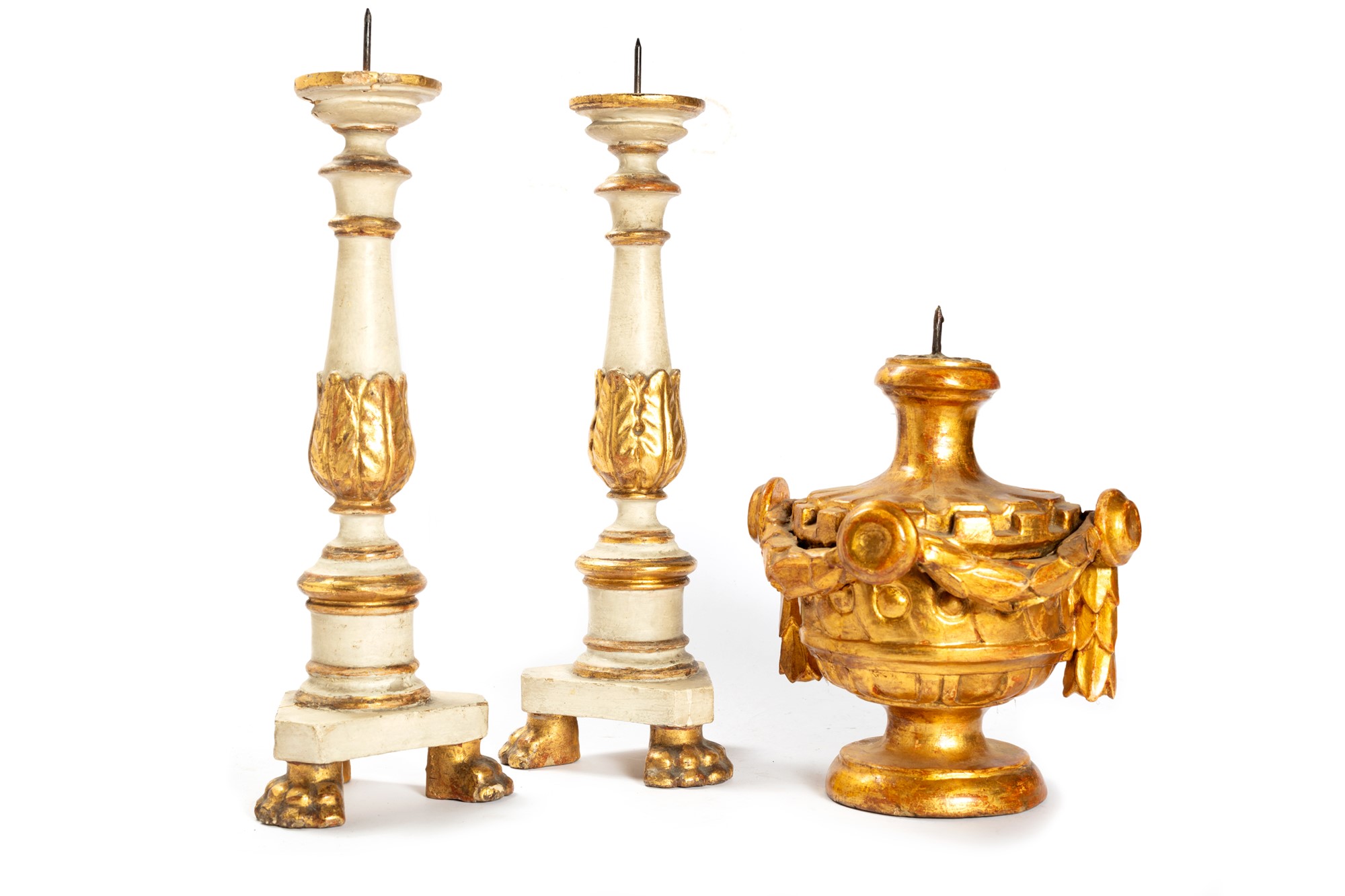 Lotto composto da una coppia di candelieri e un candeliere singolo in legno laccato e dorato, fine secolo XVIII