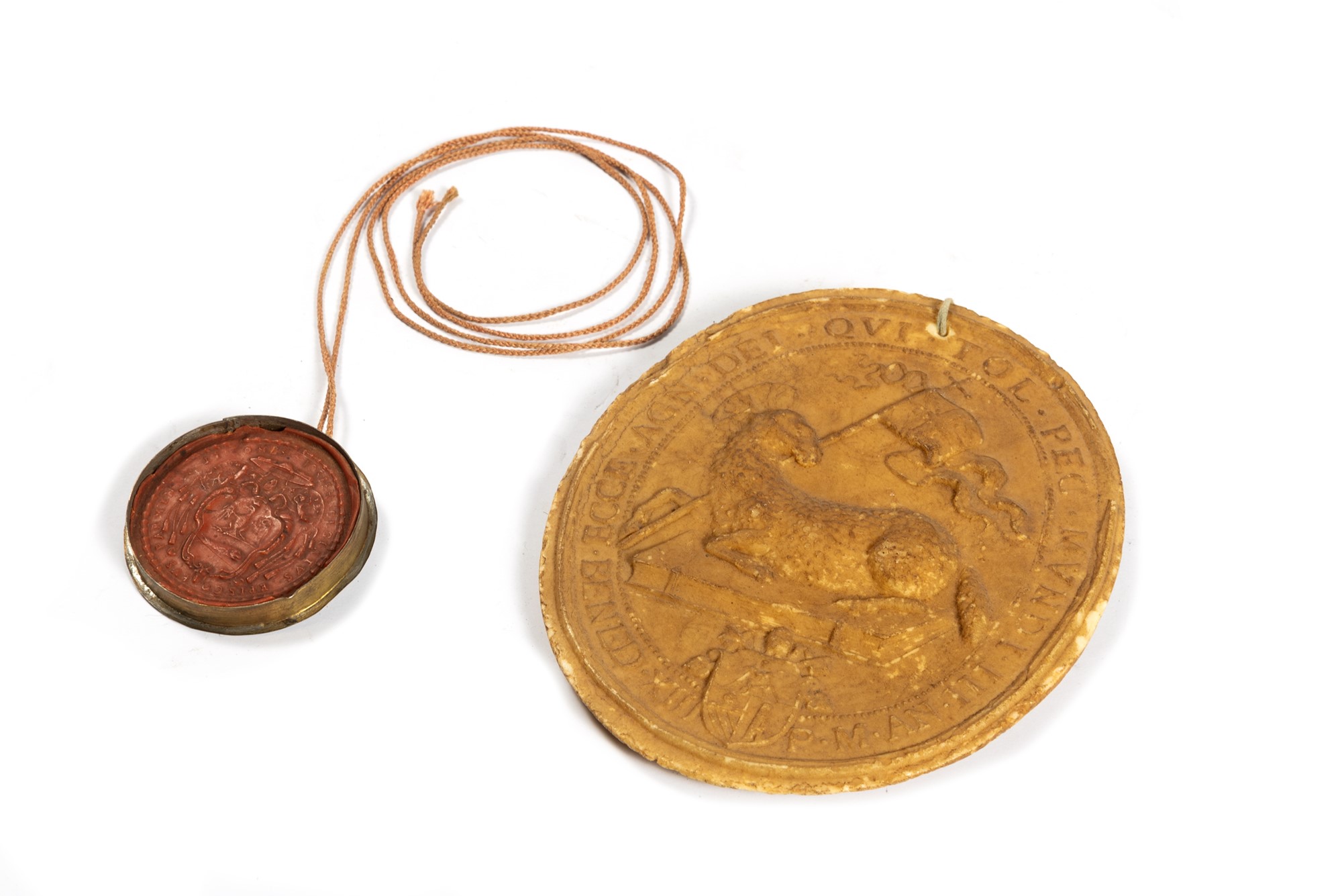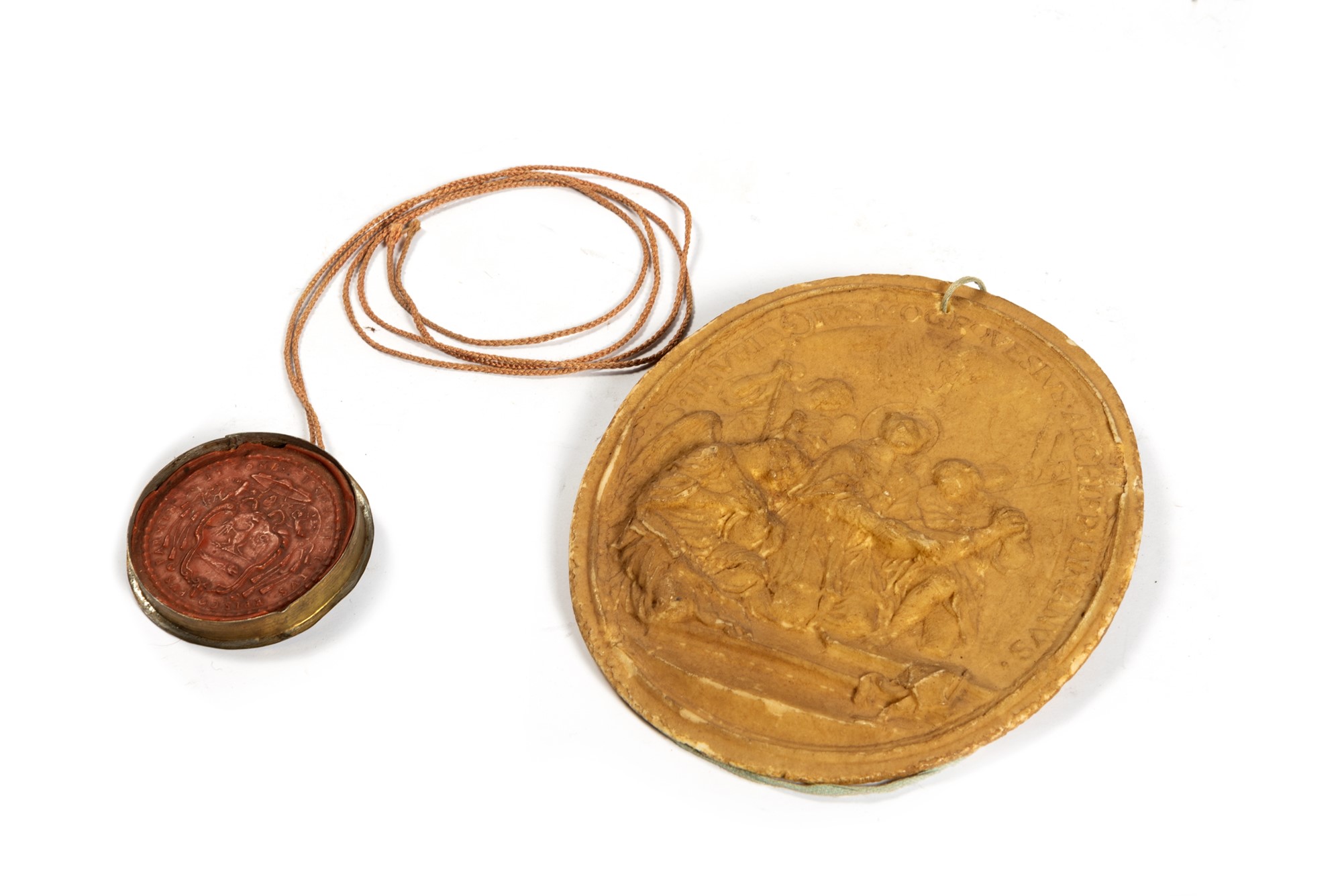 una con raffigurazione dell'Agnello Mistico sul recto e Santo con Angeli sul verso; l'altra con stemma cardinaliziouna con raffigurazione dell'Agnello Mistico sul recto e Santo con Angeli sul verso; l'altra con stemma cardinalizio